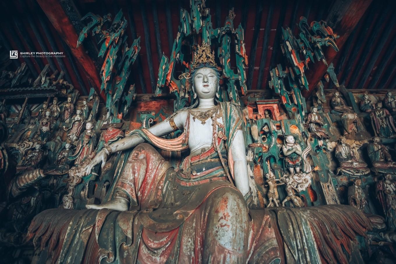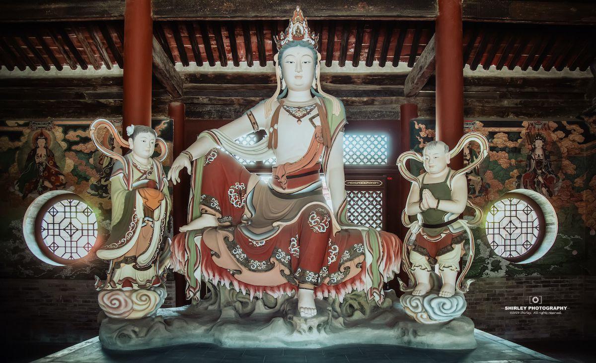 殿內塑觀音菩薩及善財童子和龍女像,爲仿明清時期的塑像,讓我想起了雙林寺千佛殿裏的自在觀音。拿出之前拍攝的舊圖對比了一下,後人新作還是欠缺了一些精緻和靈動。不過大家可以把一進院落的仿明彩塑和二、三進仿唐建築比較一下,後殿的佛像體態更加的豐腴,比例也更加的勻稱,更多展現的是盛唐氣度,也多了一份自由和活潑。