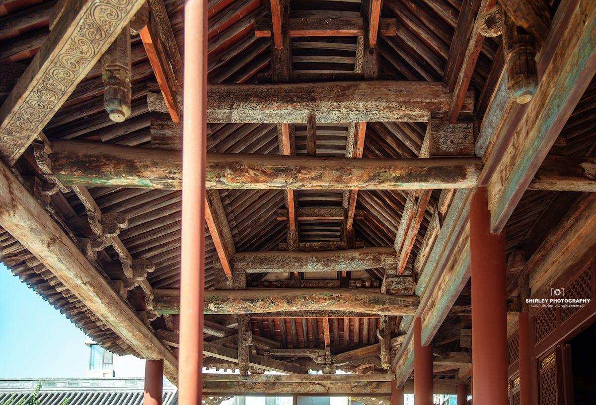 參觀普光寺,要從一進院落的圓通殿開始看起,這是寺院中唯一保留了明代遺構,保留了明代特色。大殿坐落於高臺之上,面闊五間進深四間,單檐歇山頂,前接單檐歇山頂抱廈。屋頂的孔雀藍釉琉璃瓦件與脊獸,來自幾年前大修時。從屋檐,樑柱以及木製雕花都能看出當年這座古剎的規模與歷史底蘊。殿前抱廈梁椽枋檁錯落有致;還能看到飛龍、墨色雲紋彩繪,均爲明代原物,跨越百年芳華猶存。