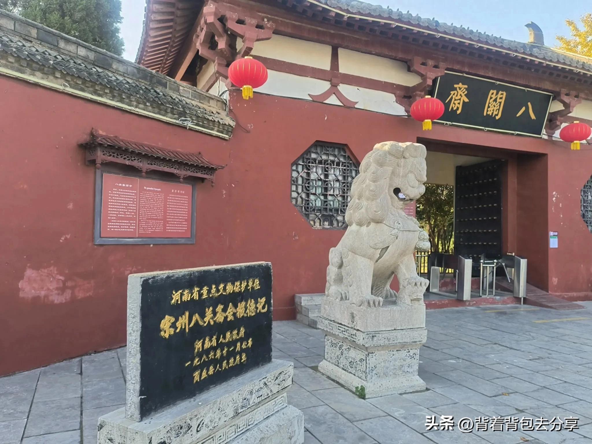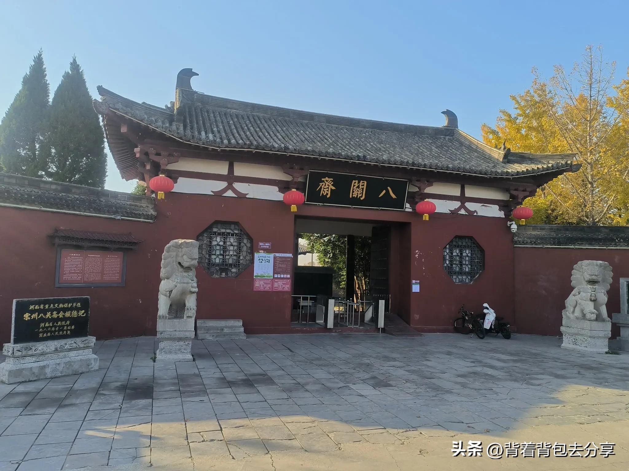 離開南城門,驅車2分鐘來到了八關齋北側的停車場,這邊有兩處景點,八關齋與張巡祠,自駕車輛停放好後,我們四人優先去往八關齋,門樓爲唐代建築風格,門楣懸掛有八關齋匾額,門前立有一對石獅,兩石獅旁邊各立石碑,東邊爲宋州八關齋會保德記,西邊是千叟宴碑,我們四人在此拍照後,來到了檢票口