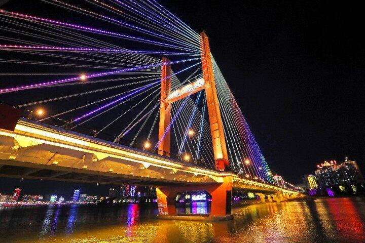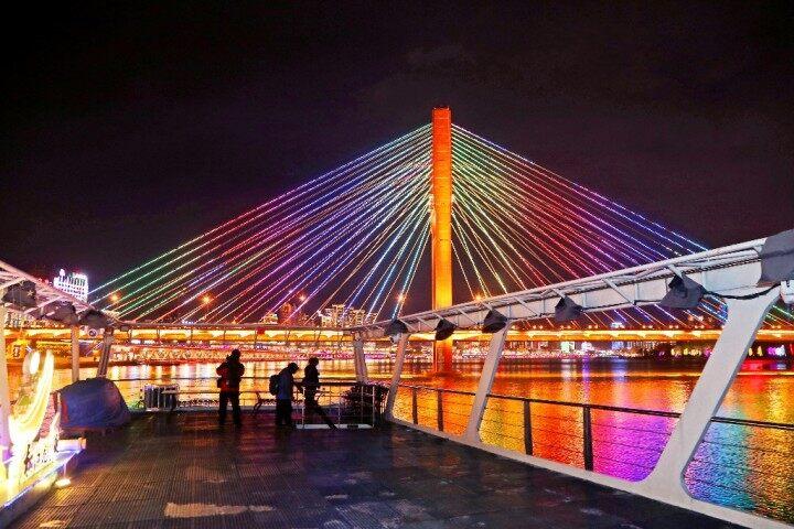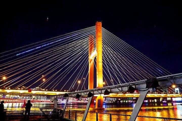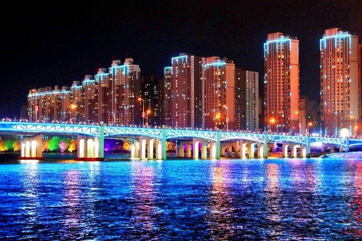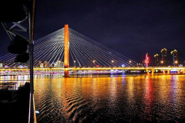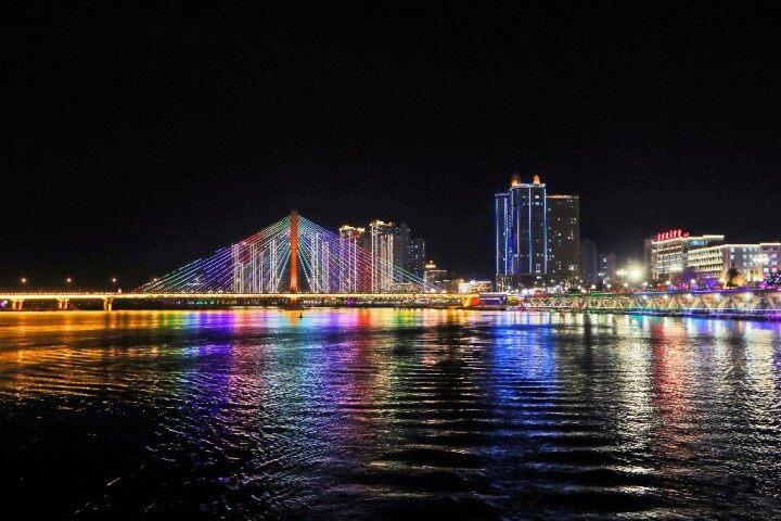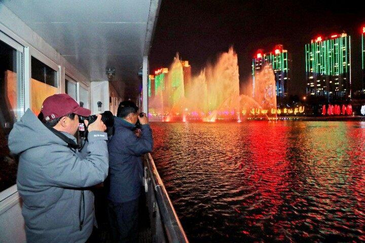 乘坐遊船夜遊松花江,是領略吉林市夜色之美的最好方式。在船上,不僅可以飽覽沿江兩岸的璀璨燈火,還可以近距離觀看江上隨着律動節奏不斷起伏的音樂噴泉和夜幕下一座座雄偉壯觀、燈火通明的跨江大橋。兩岸閃亮的景觀建築與江上的燈光秀交相輝映,無比絢爛。雖然在寒冷的冬夜,依然有大批遊客前來體驗遊船夜遊項目,以特殊的方式感受北國江城的獨特魅力。
