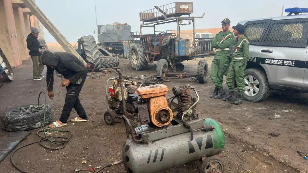 過了10分鐘左右,迎面開來一輛摩洛哥憲兵警車,減慢,招手,超過了我們幾十米後停下來,調頭開到我們車前,瞭解情況後,主動將第一次暴胎沒氣的輪胎搬上他們的警車,我和隊友坐上警車的後排,開了約20公里,往左拐進一條土路,又走幾公里路,到了一個小村莊,在一家門口堆着很多大拖拉機輪胎,很破舊而閉門的小店門口停下,警察找了幾位當地人,大約十分鐘左右來了一位中年人,開門,打氣機幾次發動不起來,換了火花塞後才能發動,給我們的輪胎打氣,查出漏氣的位置、補胎、打氣一氣呵成。