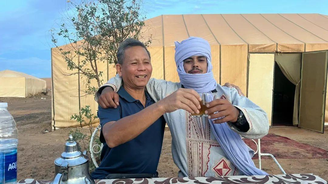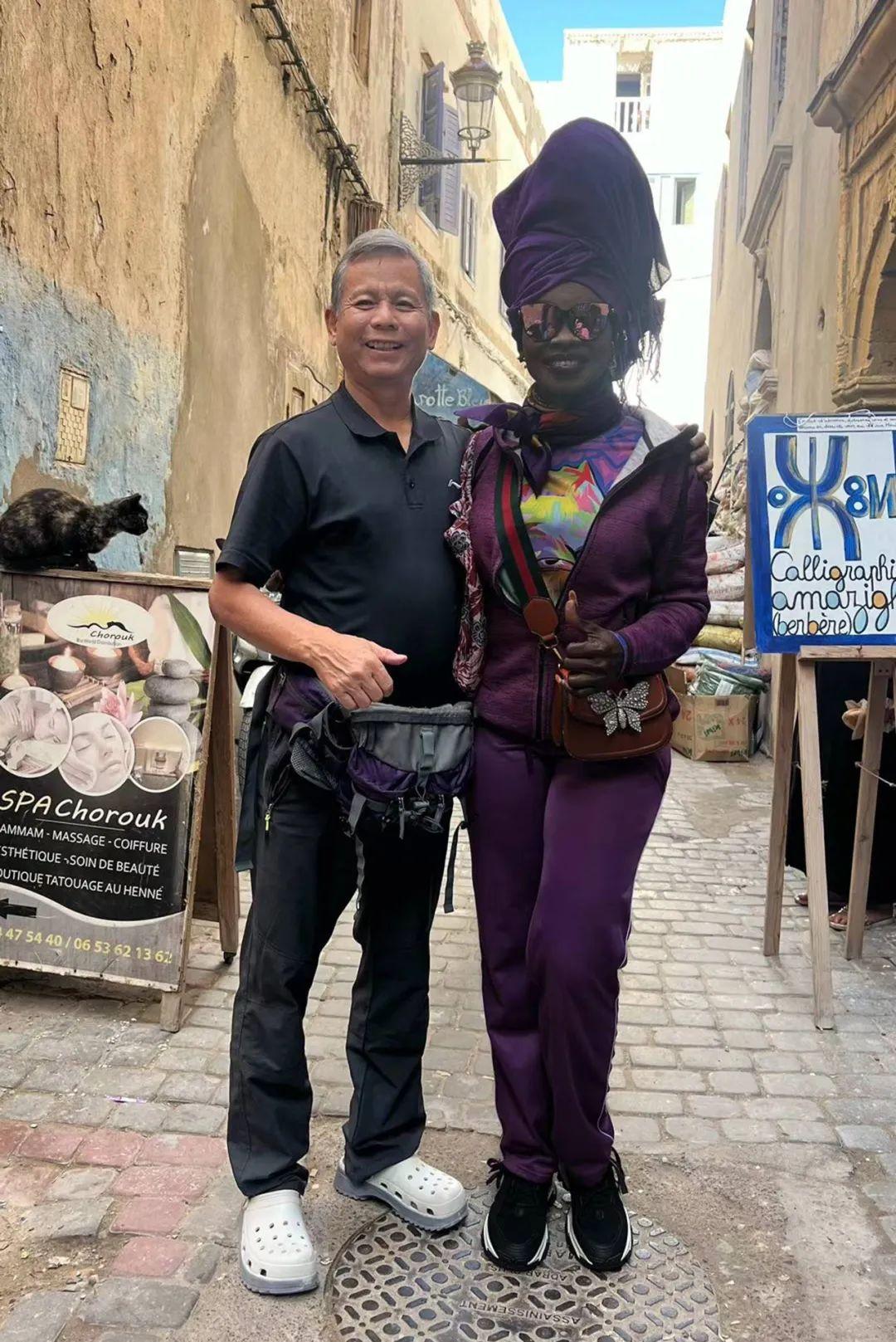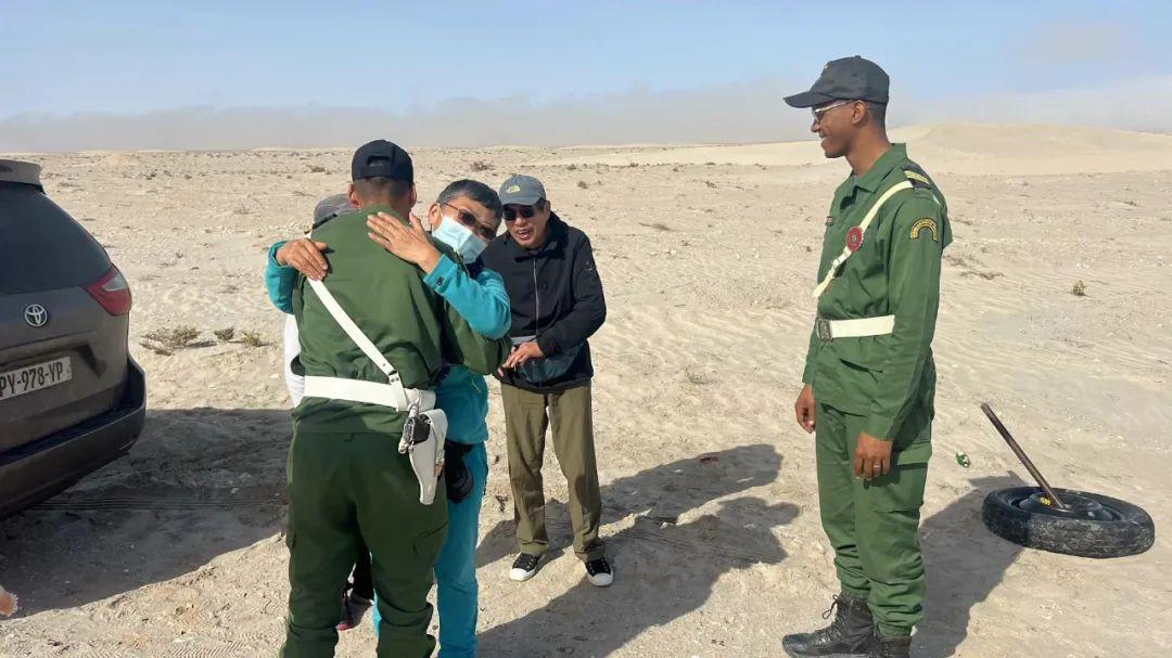 臨走時知道我們無法帶走作廢的備胎,而將備胎搬到他們的警車帶走,同時提醒我們前右和後右輪胎都有些小鼓包,囑咐路上小心,建議我們到毛里塔尼亞第一個城市努瓦迪布需要更換輪胎,並說:出了摩洛哥路況就沒有這麼好。兩位摩洛哥憲兵的所作所爲,把我們感動得一塌糊塗,真是人民的好憲兵。