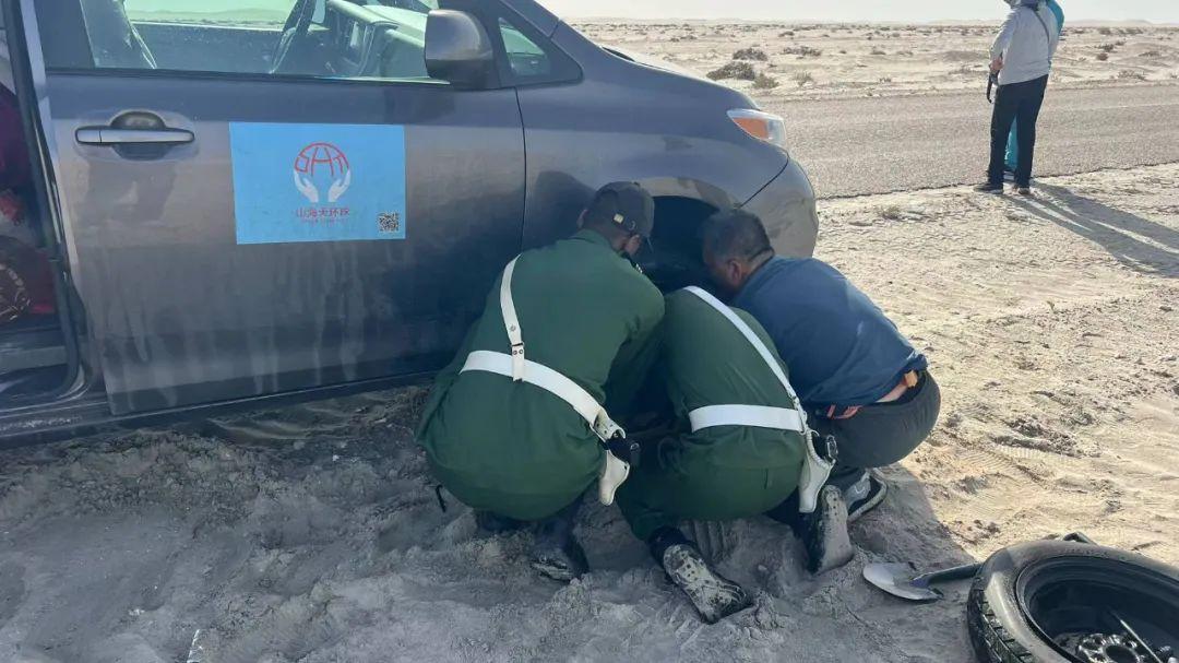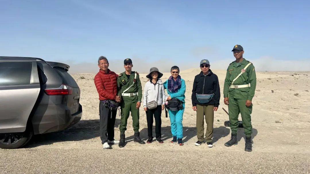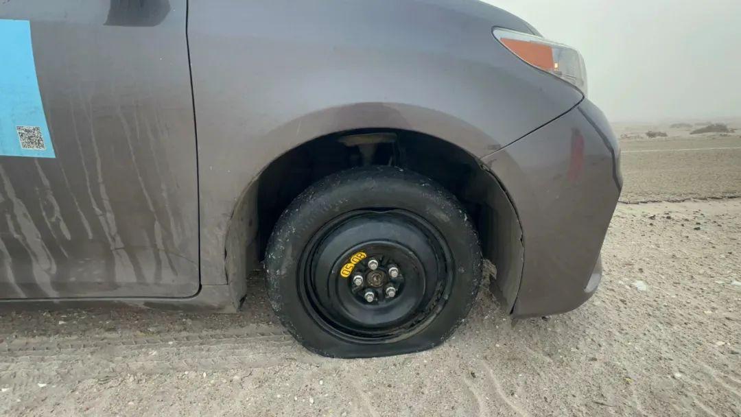 4、西撒哈拉沙漠公路,前右輪爆胎,換上備胎再爆,得到路過摩洛哥憲兵救援、補好輪胎,主動拆、換輪胎。爲了提前到達摩洛哥最南口岸,預留更多時間辦理出境手續,落地簽入境毛里塔尼亞,2024年11月7日早上5點從摩洛哥達赫拉出發,計劃11點到達口岸。 人算不如天算,開了100多公里後,高速越過一個深坑後,感覺輪胎異常,停車檢查,前右輪已經爆胎,隊友同心協力更換不同尺寸的小備胎後,繼續往前走,再次經過一個深坑後,新換上胎又爆胎。