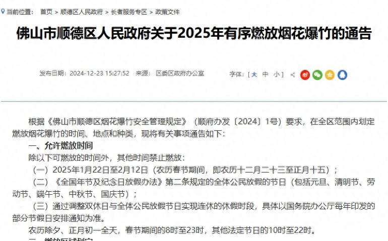 12月23日,佛山市順德區政府官網發佈《關於2025年有序燃放煙花爆竹的通告》。通告明確,允許燃放煙花爆竹的時間段包括:農曆春節期間(農曆十二月二十三至正月十五)、元旦、清明節、勞動節、端午節、中秋節、國慶節。其中,農曆除夕、正月初一全天,春節期間的8時至23時,其他法定節日的10時至22時。通知還劃定了具體的燃放區域以及允許燃放煙花爆竹的種類。