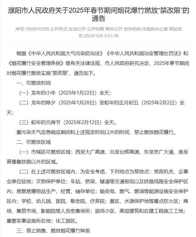 12月6日,濮陽市人民政府發佈《關於2025年春節期間煙花爆竹燃放“禁改限”的通告》。