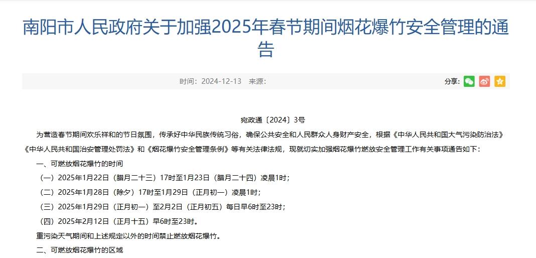 12月12日,南陽市人民政府發佈《關於加強2025年春節期間煙花爆竹安全管理的通告》。
