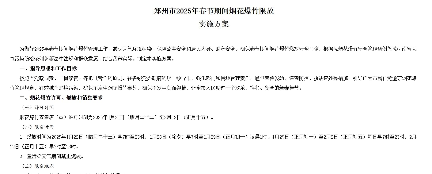 11月29日,鄭州市人民政府辦公室發佈《關於印發鄭州市2025年春節期間煙花爆竹限放實施方案的通知》,方案對2025年春節期間煙花爆竹的燃放時間、燃放區域等作出規定。