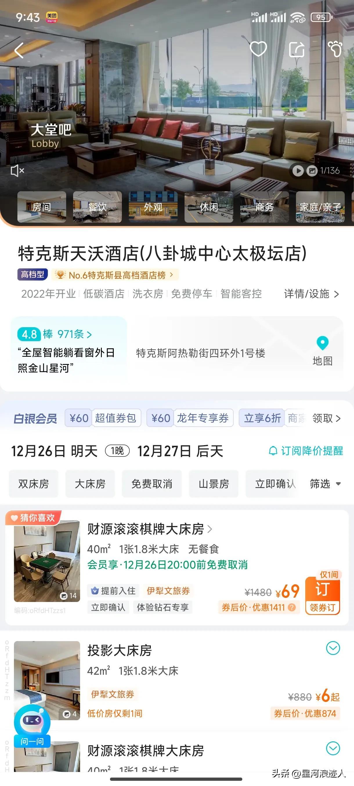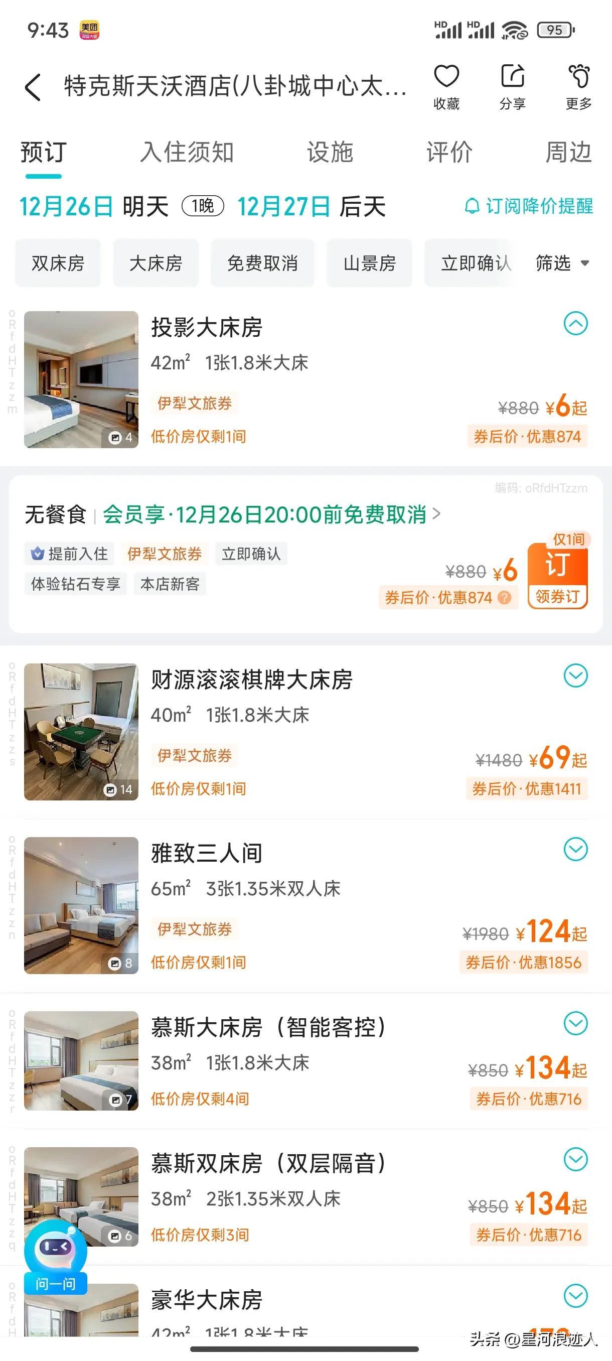 看了一下平臺上的訂購信息的確最低是六塊錢,原價881晚的房價一下子就降到最低六塊,而且還是一米八的大牀房,房間的面積也有40平米左右,很多人看了其實都非常心動。是不是來這邊旅遊住一晚就省了800塊。看到訂購信息的頁面,上面寫有“伊犁文旅券”,這說明是酒店跟當地的文旅局共同推出的優惠券,這也是當地文理區爲了吸引遊客的到來,跟酒店合作推出一系列的優惠活動政策。當地很多酒店都加入了這樣的政策,這也是能夠吸引遊客前來的主要手段之一吧,北京在住宿費用這一塊少了很多,對於很多人來說其實還是挺心動的,而且伊利這個地方景色還是很美,也值得去遊玩,既然又能省錢又能遊玩,很多人可能都會到這裏旅遊了。