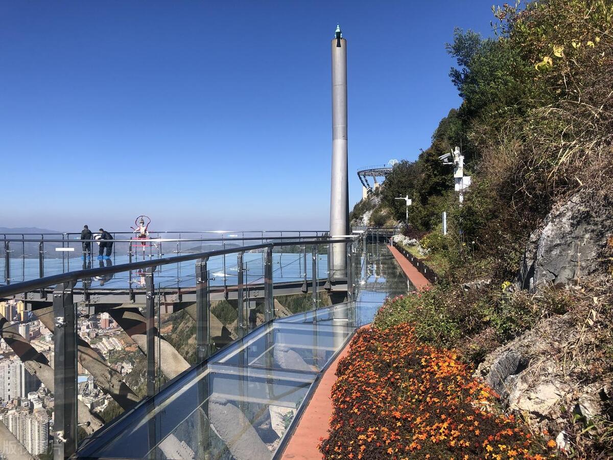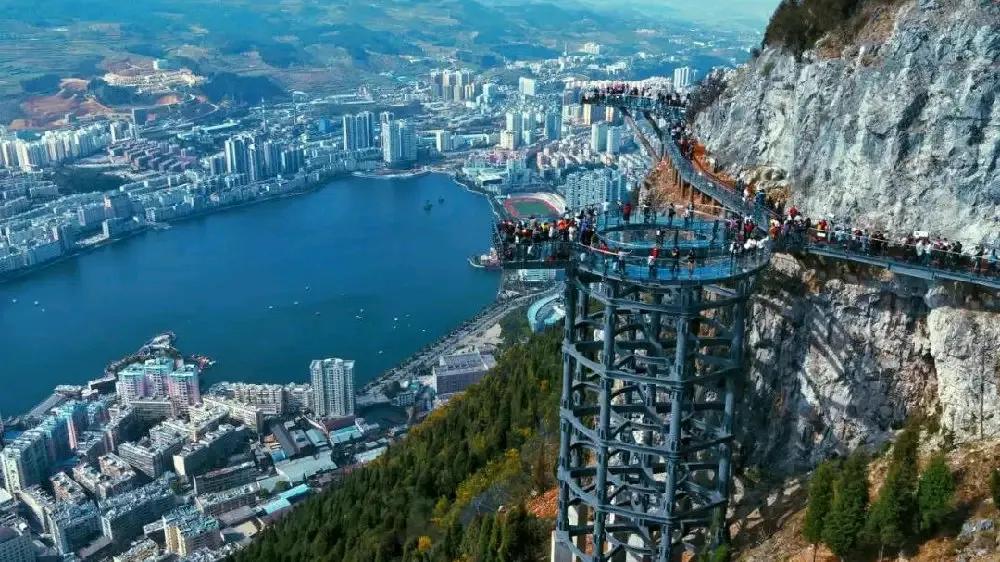 老陰山,它的海拔比城區高400多米,山頂有玻璃棧道、寺廟,還有座金剛塔,站在塔的高處,箇舊全貌可一覽無餘。