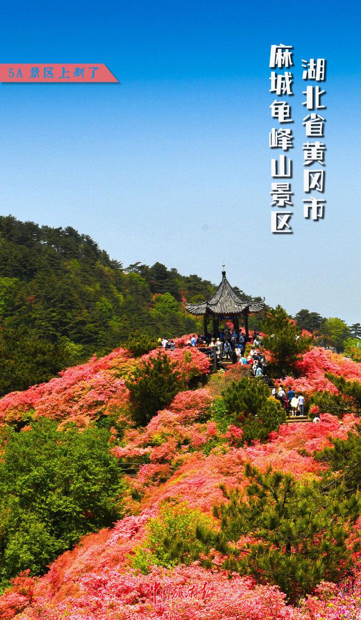 由神奇的龜首、雄偉的龜背和逼真的龜尾等九座山峯組成,因其地形山勢酷似一隻昂首吞日的神龜而得名“龜山”,是大別山中的名山。每年四五月份,湖北省麻城市龜峯山上10萬畝杜鵑花絢爛綻放,層層疊疊,漫過峯巒山谷,如霞似錦,如夢如幻,令人流連忘返。