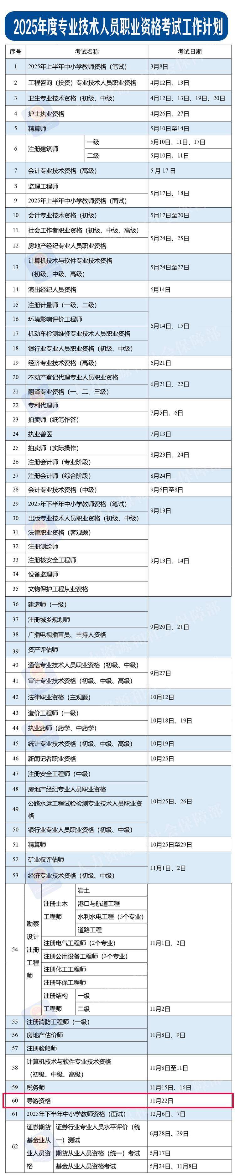 近日,人力資源和社會保障部辦公廳印發《關於2025年度專業技術人員職業資格考試工作計劃及有關事項的通知》。大家關心的考試時間表定了!2025年導遊資格考試定於11月22日。詳戳↓