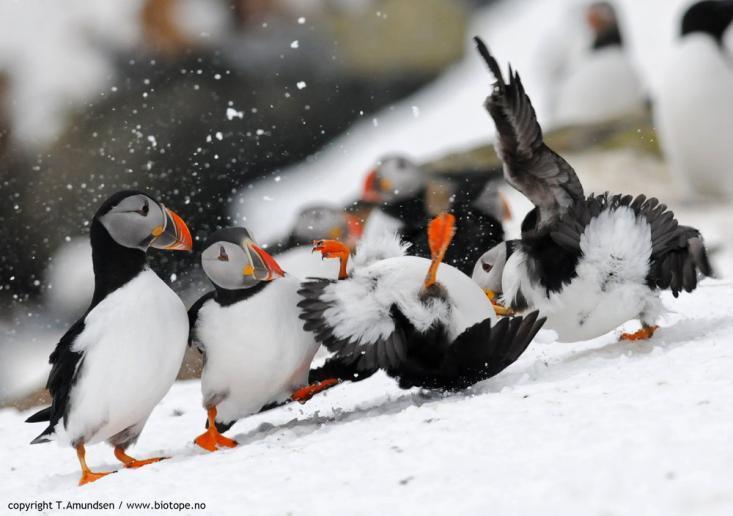 早餐後,乘衝鋒艇觀海鸚鵡和鯨魚,這裏是挪威的一個自然保護區,是海鸚鵡的棲息地,每年的三月中旬,海鸚鵡登陸築巢,爭搶地盤,之後在這裏交配產卵,孵化,隨後前往帝王蟹工廠參觀,午餐享用帝王蟹餐和viking sushi
