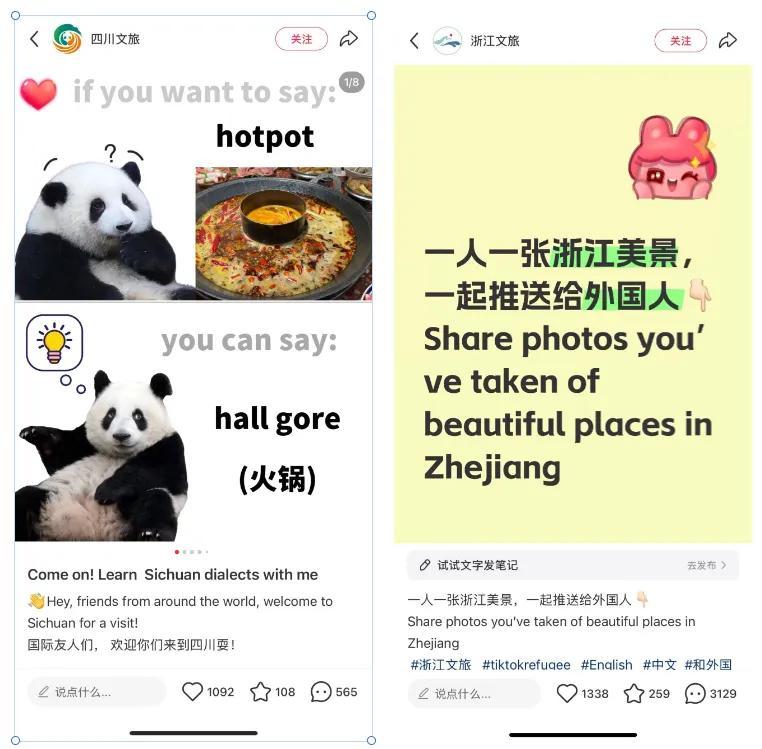 四川文旅用大熊貓和“巴適”(bus)成功圈粉。浙江文旅發動“小紅薯”們一人一張浙江美景,共同推送給外國友人。
