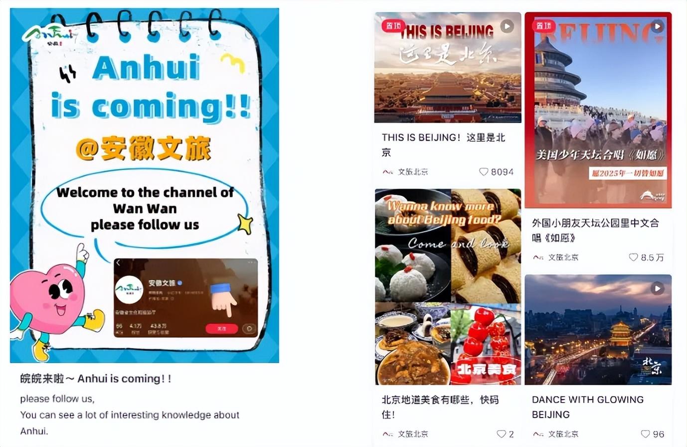 安徽文旅向海外網友展示了美麗的山巒雲海以及安徽的筆墨紙硯、徽劇等非遺。北京文旅秀出城市文化底蘊,展現首都的獨特魅力。