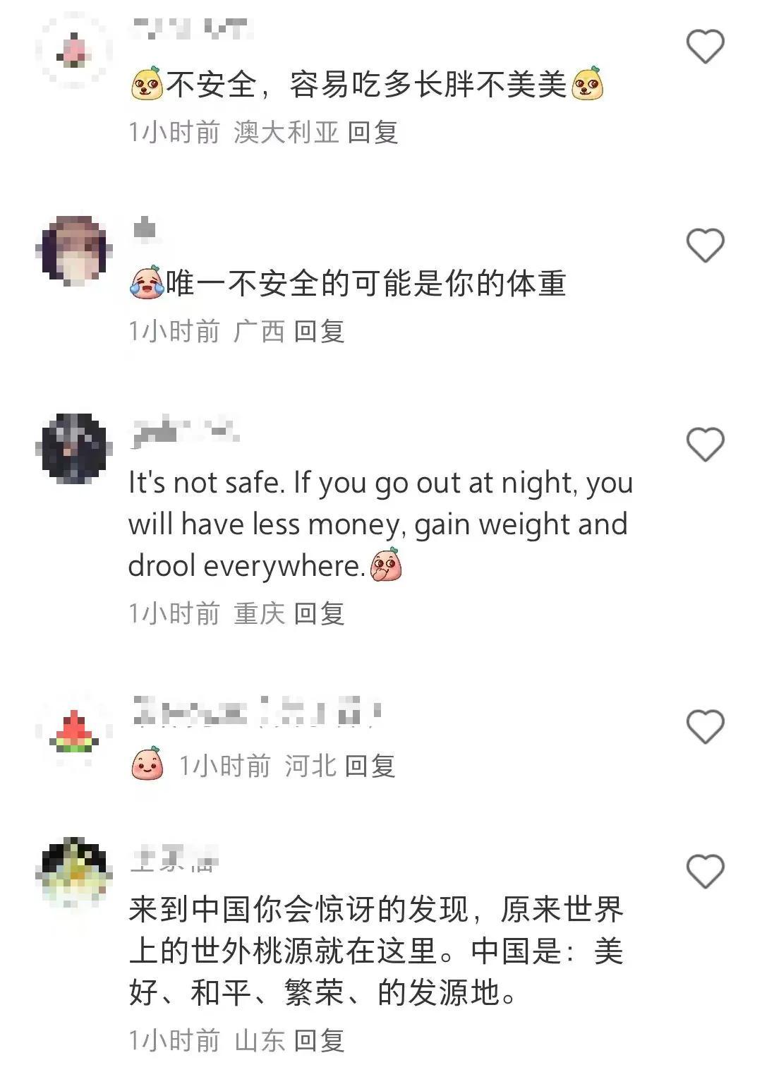 有網友回覆:“在地球上沒有比中國更安全的地方。”也有調皮的網友回答:“唯一不安全的可能是你的體重”。