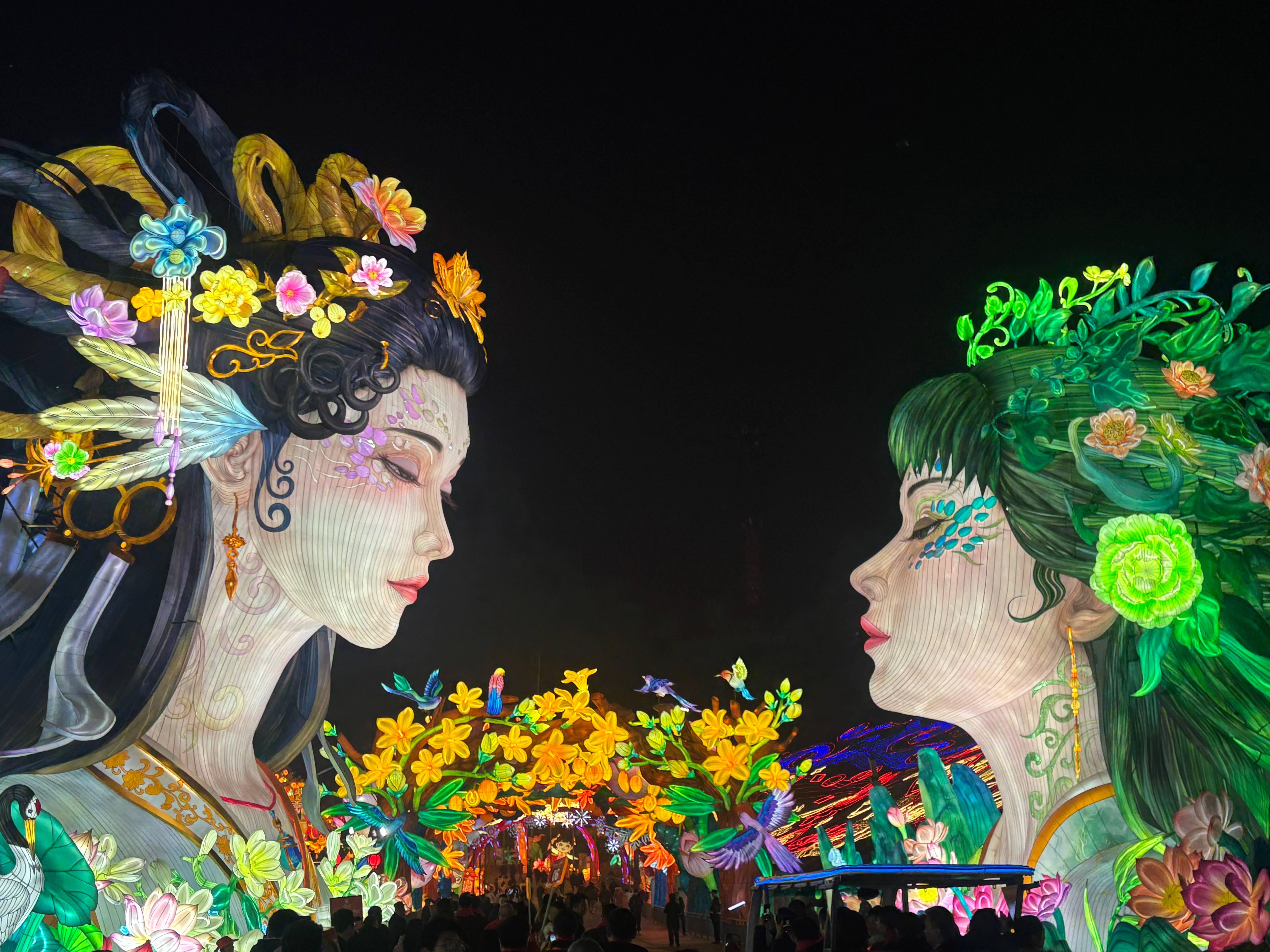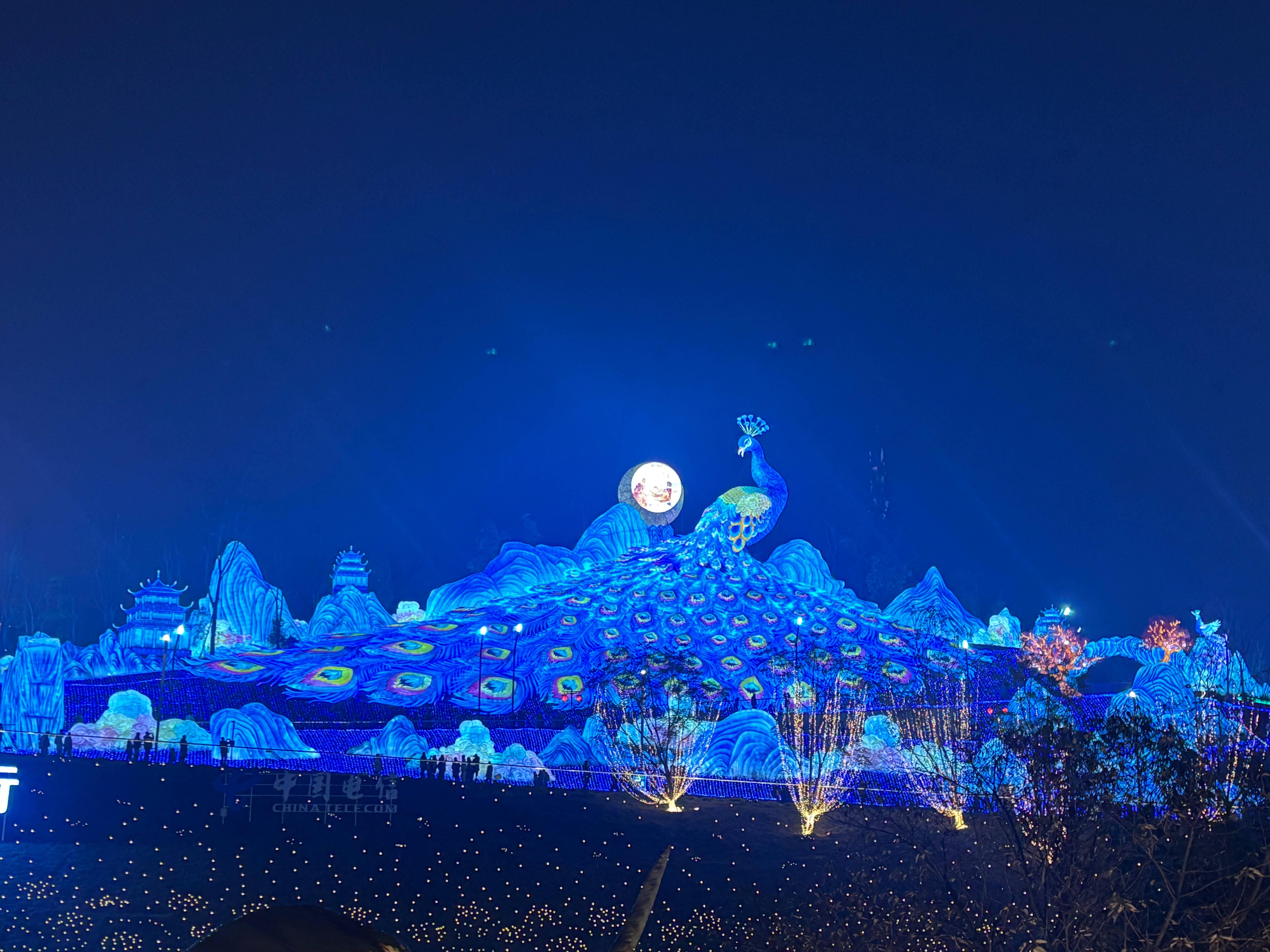 距離“五穀豐登”燈組不遠,長140米、寬50米、高35米的“孔雀合屏”燈組盡顯華麗之美。精湛的工藝和先進的燈光技術,將孔雀的羽毛細節和色彩展現得栩栩如生。