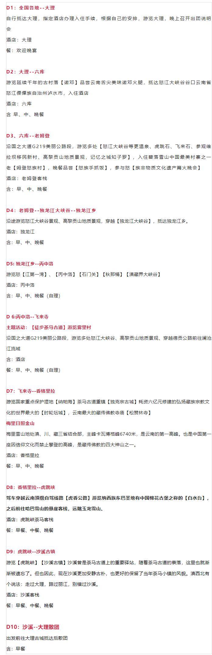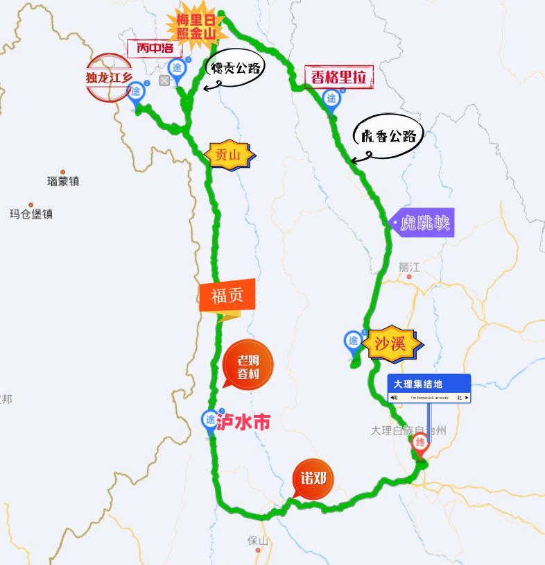行程路線參考:大理→六庫→老姆登→貢山→獨龍江→丙中洛→飛來寺→香格里拉→虎跳峽→茶馬客棧→沙溪→大理(10天9晚)