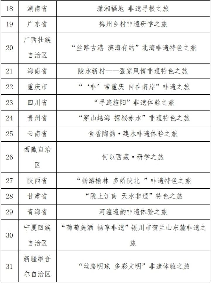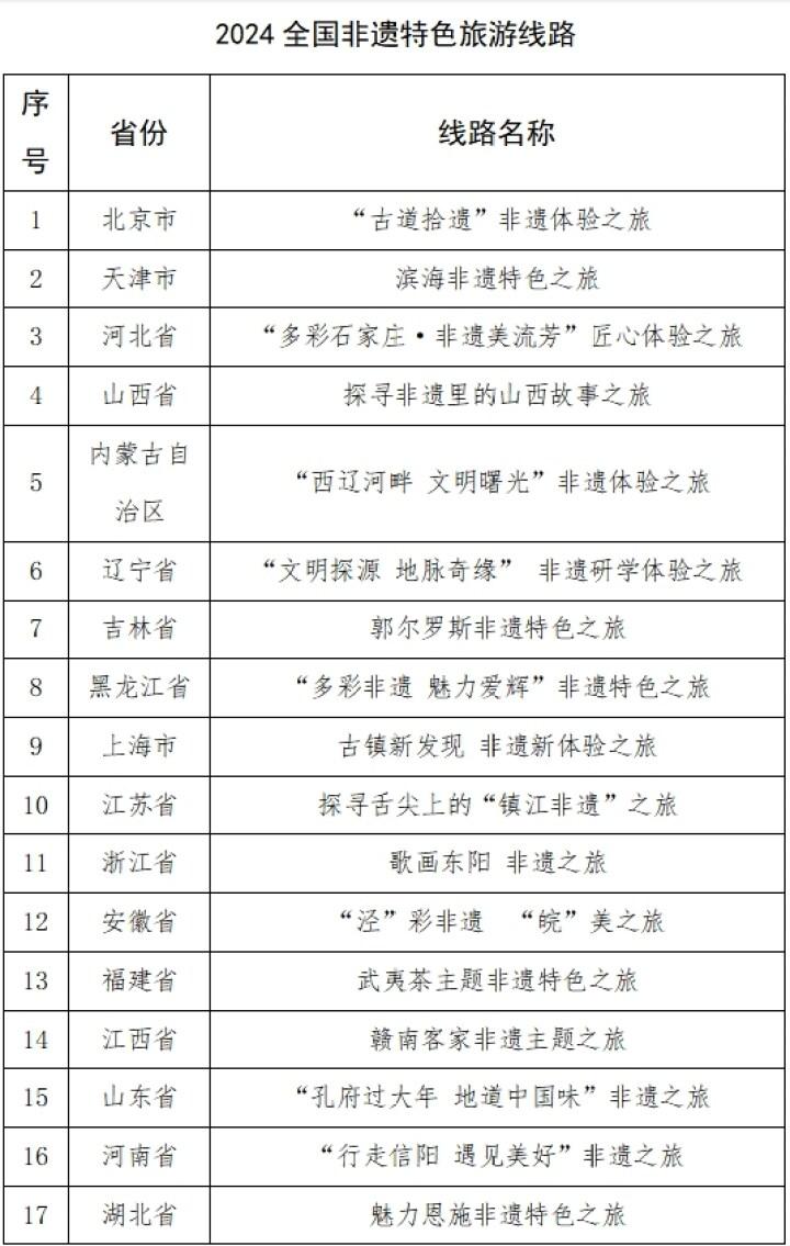 爲深入貫徹落實黨的二十大精神和習近平總書記關於非物質文化遺產保護工作的重要指示精神,推動非遺與旅遊深度融合發展,文化和旅遊部非物質文化遺產司委託中國旅遊報社於2024年11月開展了“2024全國非遺特色旅遊線路”徵集宣傳活動。截至12月徵集結束,活動共收到全國各地報送的非遺特色旅遊線路197條。依據主題明確,特色性強、內容豐富,體驗性強、參與性廣,傳播力強、評價良好,市場性強、經濟效益與社會效益相統一等五方面遴選要求,經各地推選、專家評議,全國31條主題明確、體驗感好、代表性強、兼具經濟效益與社會效益的非遺特色旅遊線路入選。