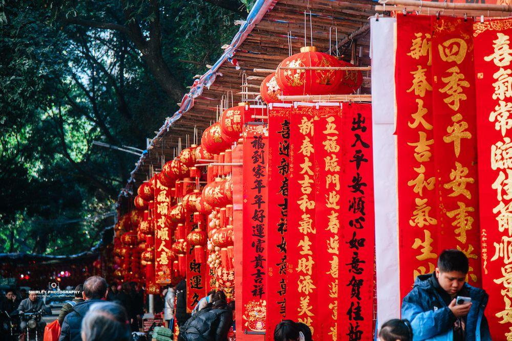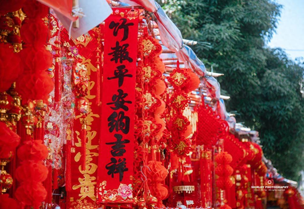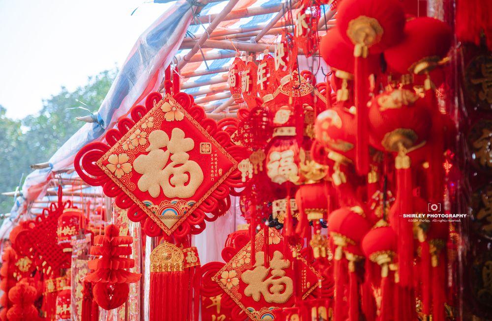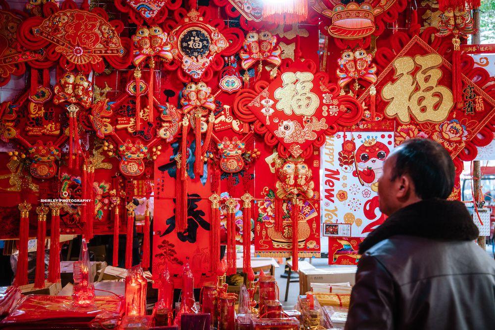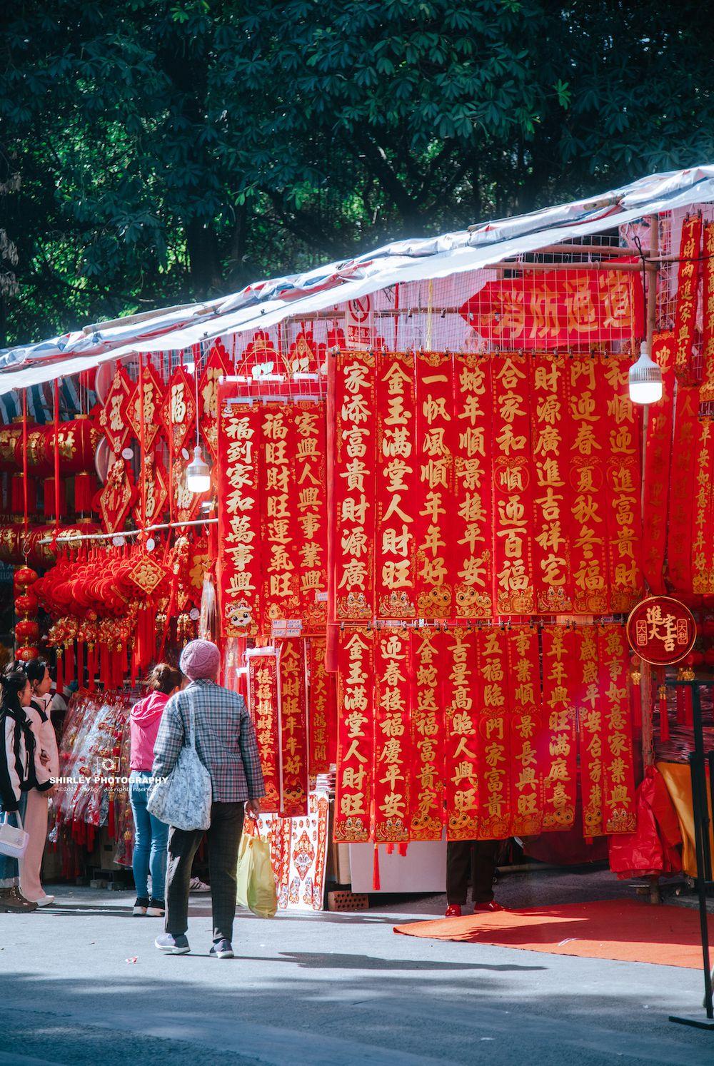 交易場裏,各式各樣的平價對聯,福字、燈籠、紅包、中國結、生肖玩偶等春節裝飾一應俱全,擺放在店鋪的顯眼位置,帶着人們對新春的期許。整條街在店主們內卷之下,年味滿得快要溢出來!本來我們只是來遊玩拍照的,最後還是被市場裏的氛圍所感染,挑了兩對春聯帶回家。雖然網購選擇多,但是線下購買所見即所得,也更有節日儀式感。