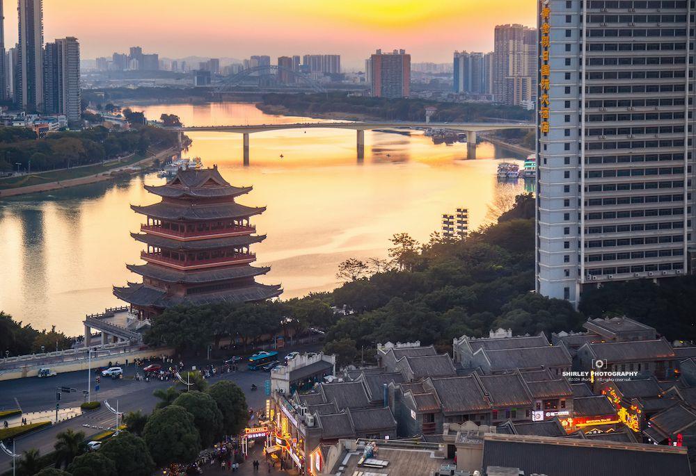 不遠處還有南寧另一地標建築暢遊閣,號稱邕江第一觀光樓,你一定已經在各種海報、照片、宣傳片裏見過它。這裏最美的時候就是每天黃昏到夜晚開燈這段時間,配合眼前三街兩巷古色古香的屋頂,周圍市區的天際線與背後蜿蜒曲折的邕江,這樣古今交融的畫面早已是南寧明信片式的風景。悄悄說,在興寧路上找到“百盛步行街2號門”上22樓,你也能獲得攝影師同款角度。