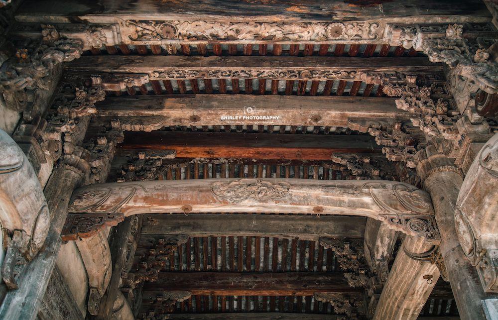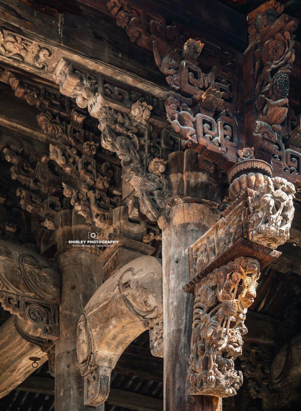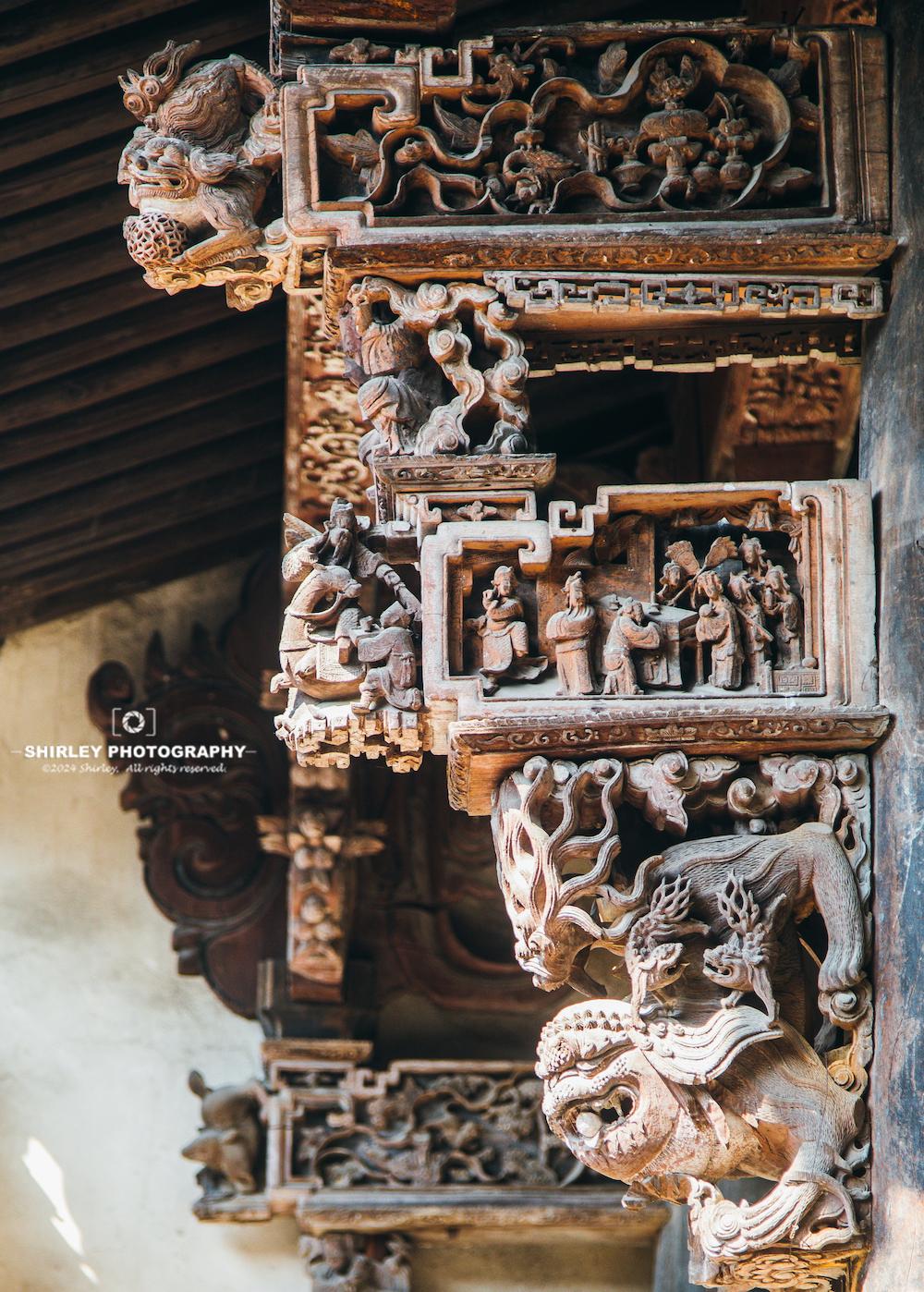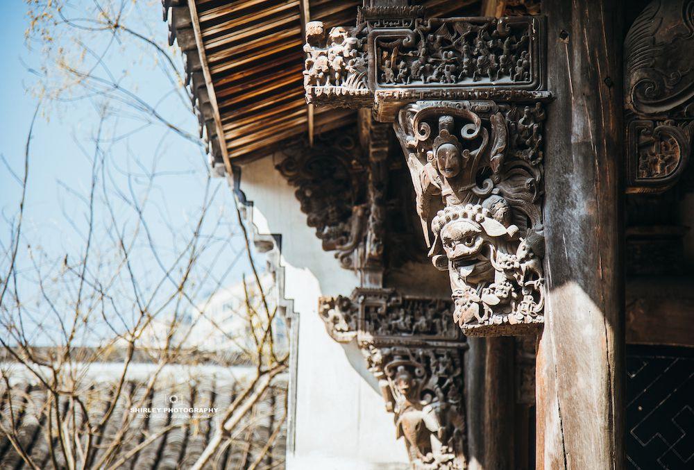 有了這些基礎,逛盧宅時木雕就是一大看點。漫步其間,隨便一抬頭或是一瞥,便會與奢華繁複的東陽木雕撞個滿懷。無論是門窗、梁枋、牛腿、雀替、或是斗拱,無時無刻都在彰顯着東陽木雕的巧思妙想。雕花題材涉及人物故事、花鳥魚蟲、神話傳說;刀法細膩流暢,讓人不禁爲工匠的精湛技藝所折服。偌大的盧宅,堪稱一座露天的“東陽木雕博物館”。