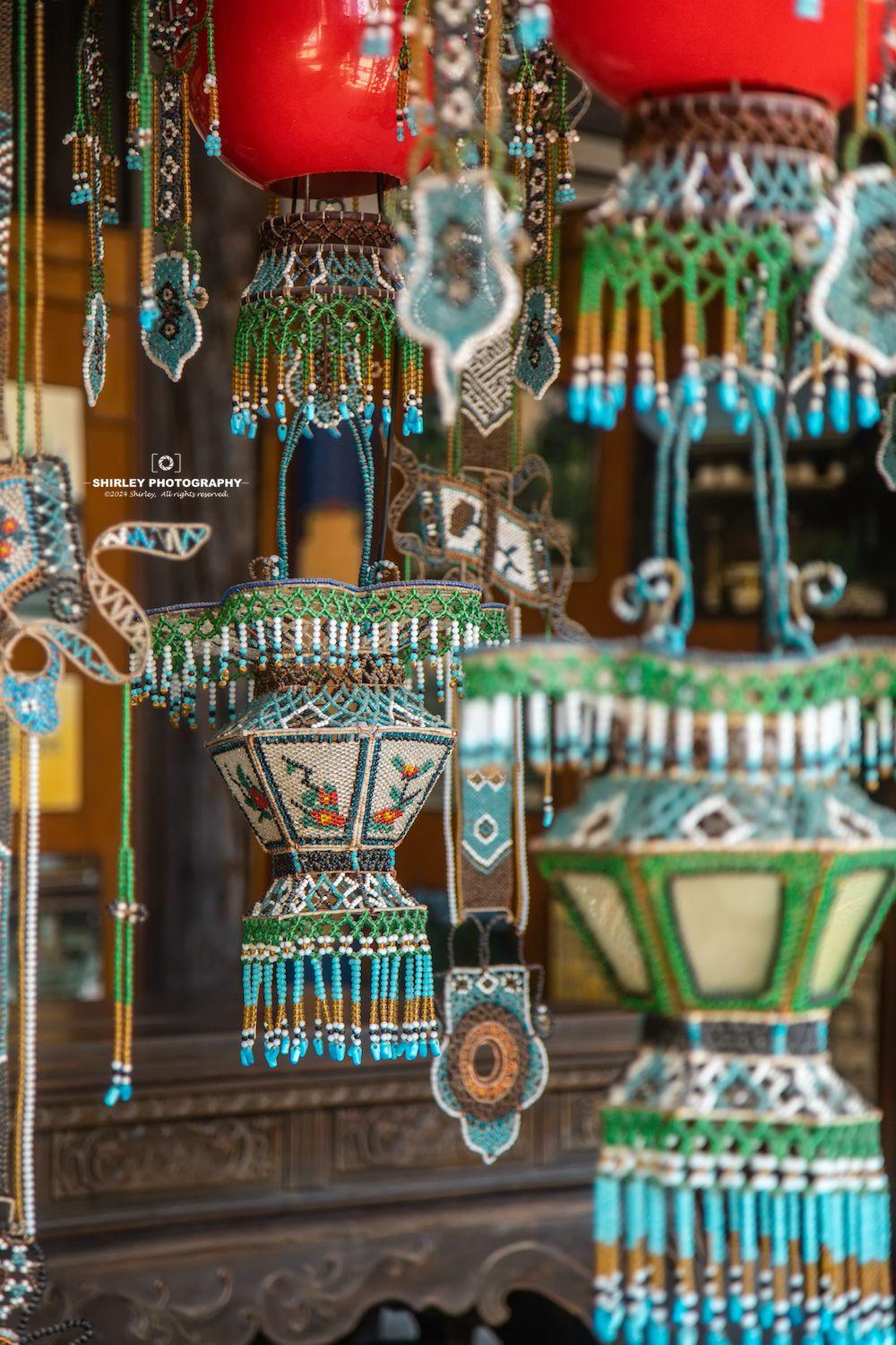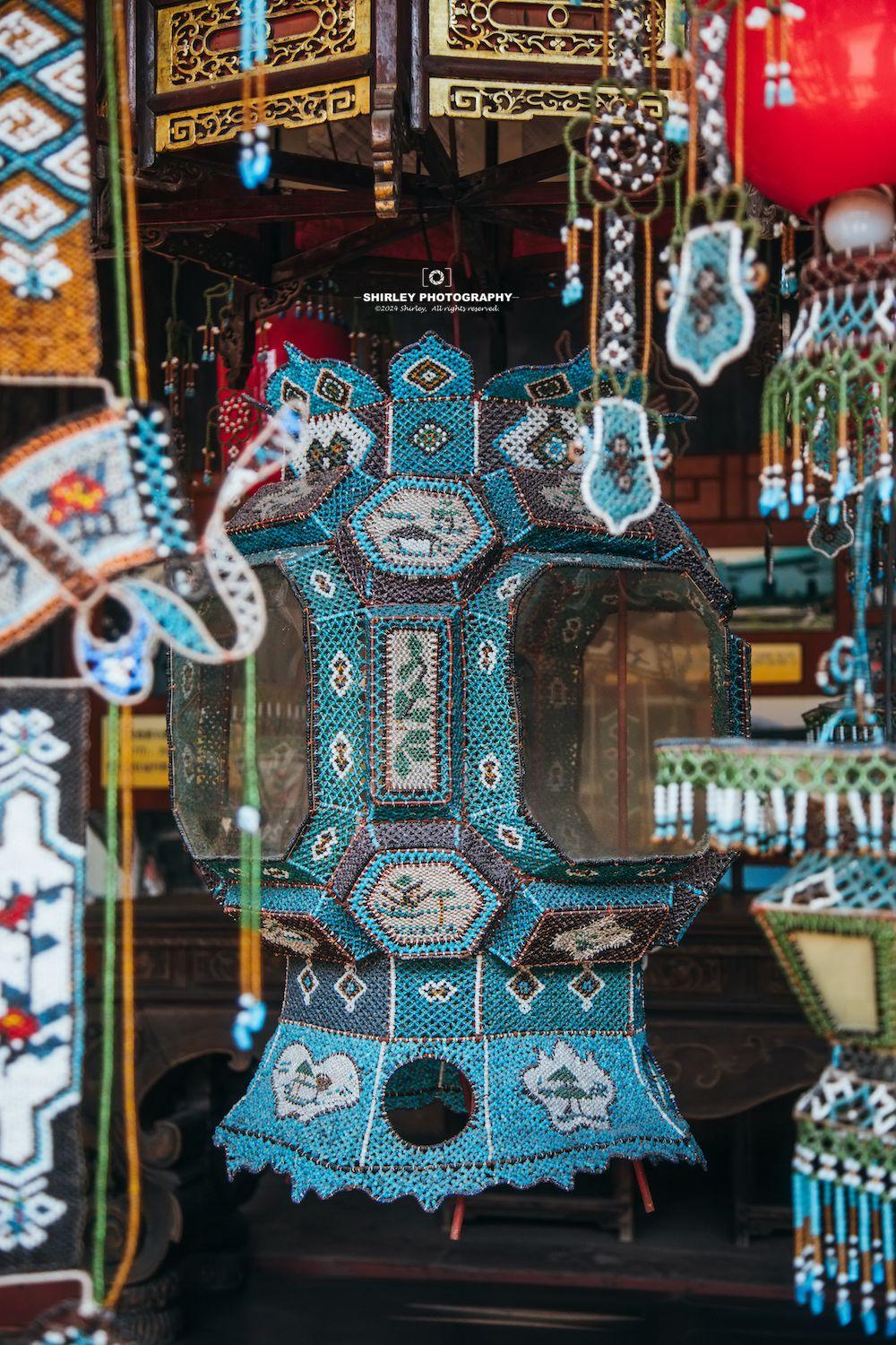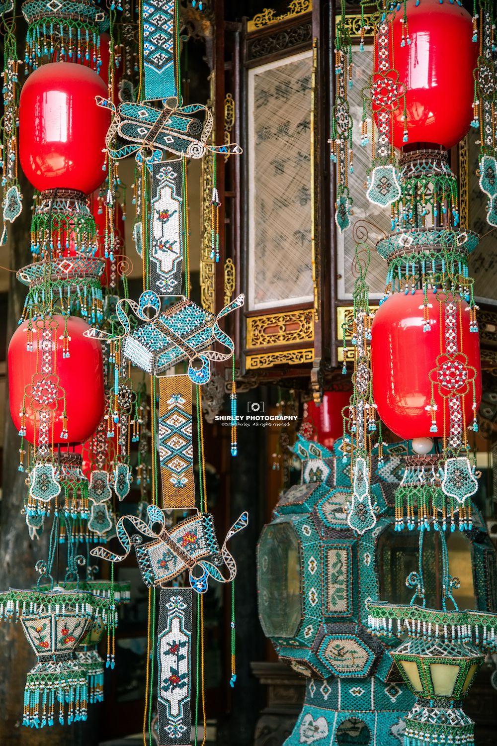 除了木雕之外,盧宅另一大看點就是製作於1919年的寶蓋索絡聯三聚七彩穗羊角燈。這是一盞六角形,通高4.05米,直徑2.10米,重127.5公斤,用40萬顆玻璃彩珠穿就的堂燈,已載入世界吉尼斯紀錄。遠觀近看皆如視覺盛宴,猶如一座燈山光彩耀目,與《紅樓夢》中提到的榮國府大堂燈如出一轍,只是肅雍堂大堂燈更勝一籌。