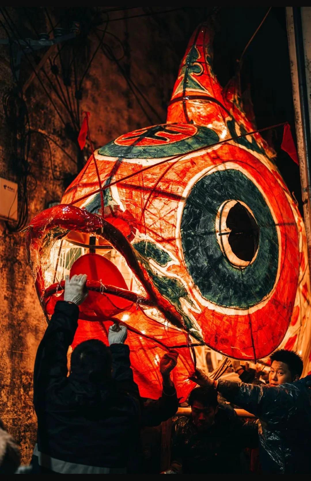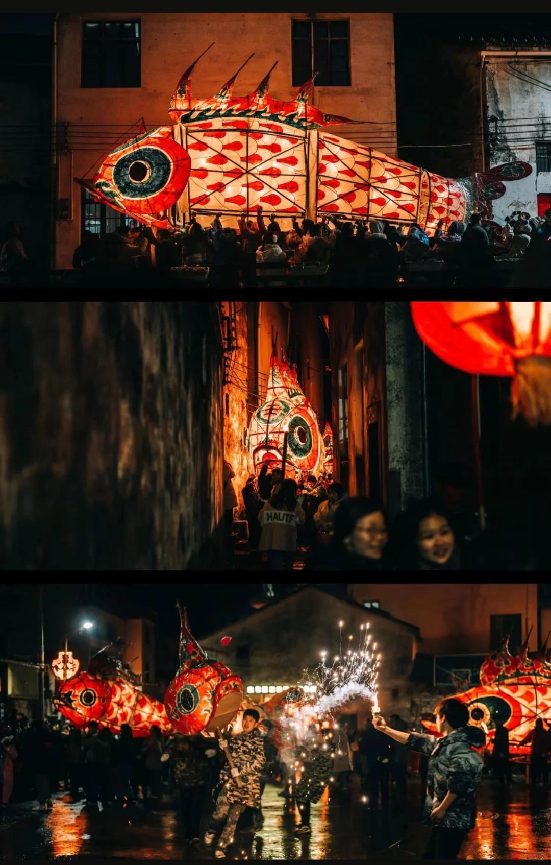 魚燈遊行時由大扁燈開路,更有來往爆竹相送。魚燈隊從祠堂中魚貫而出,像一隻流光溢彩的長龍劃破長夜,將祝福送到千家萬戶。