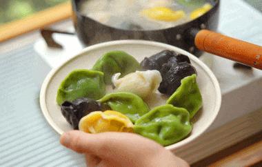 而佼佼者當屬鮁魚水餃,佐以適量的五花肉餡、韭菜,包入用墨魚汁、菠菜汁、南瓜汁和好的彩色麪皮,那叫一個活色生香。