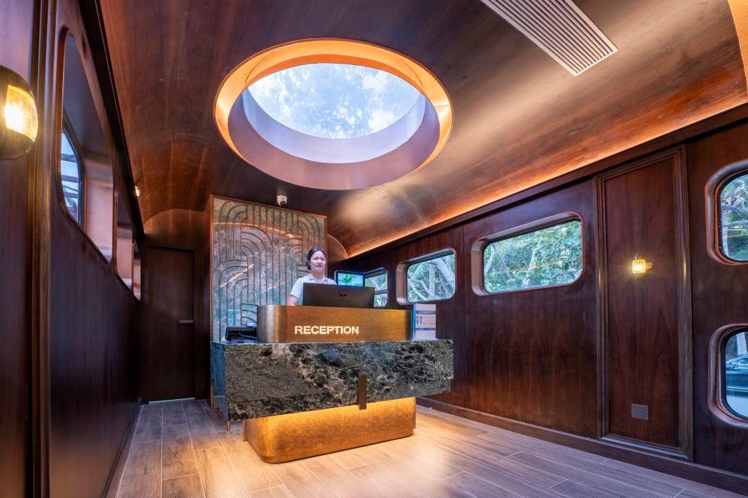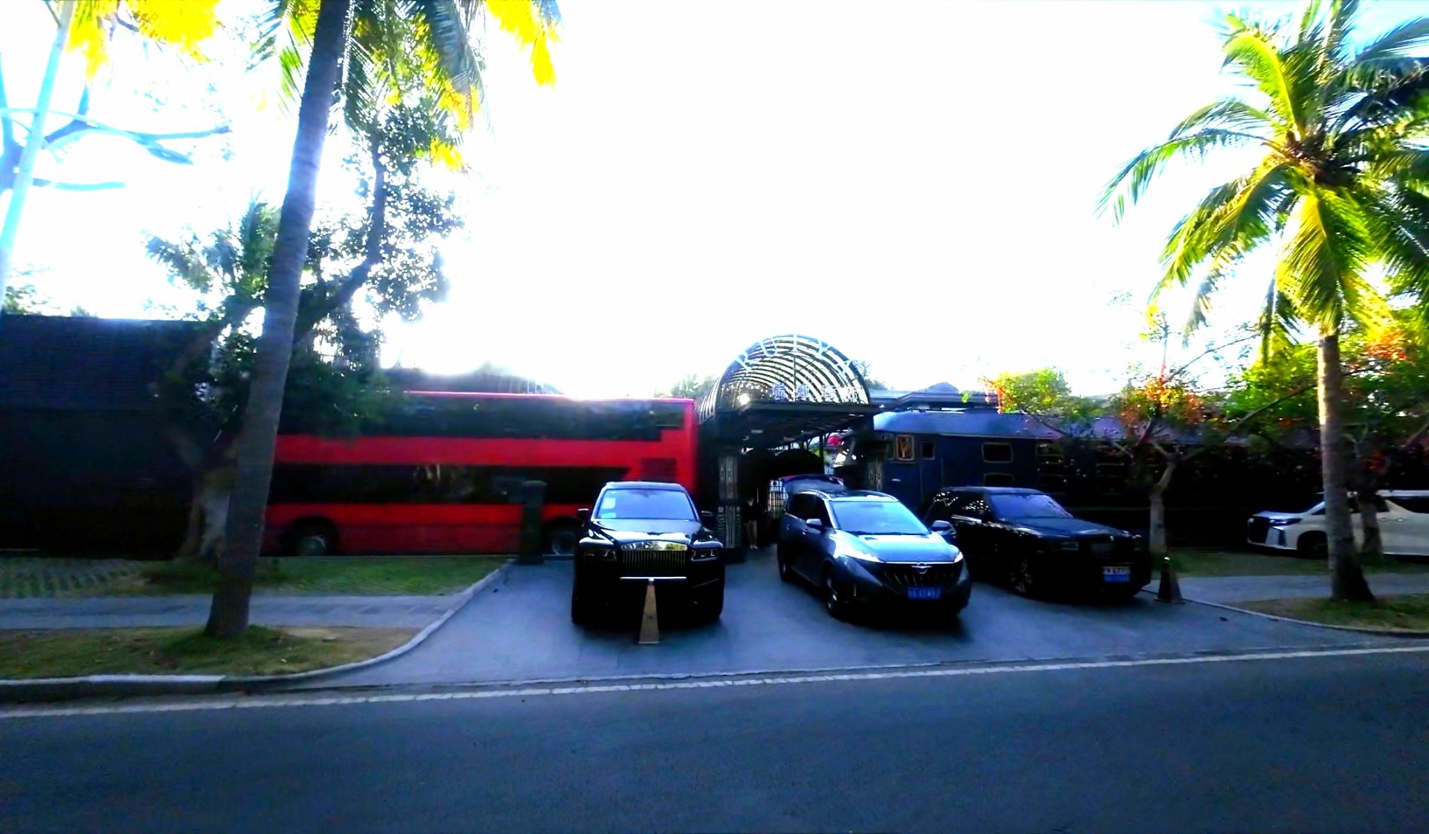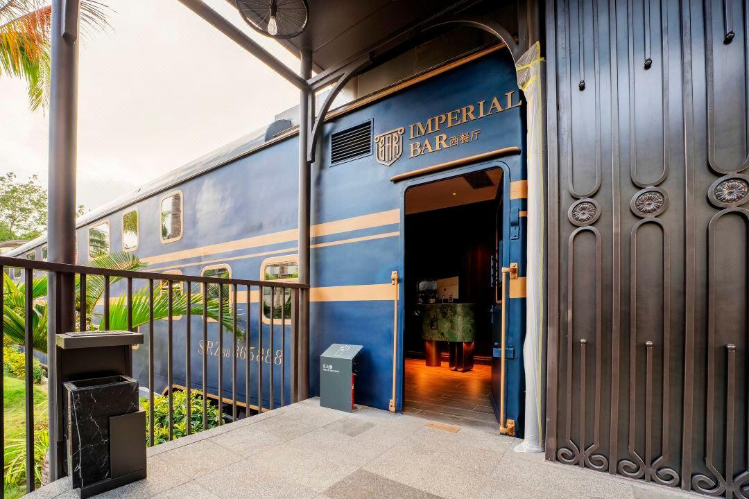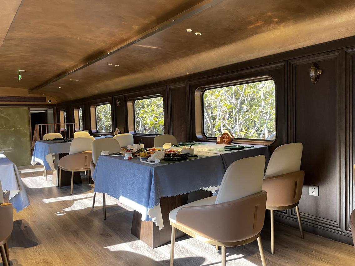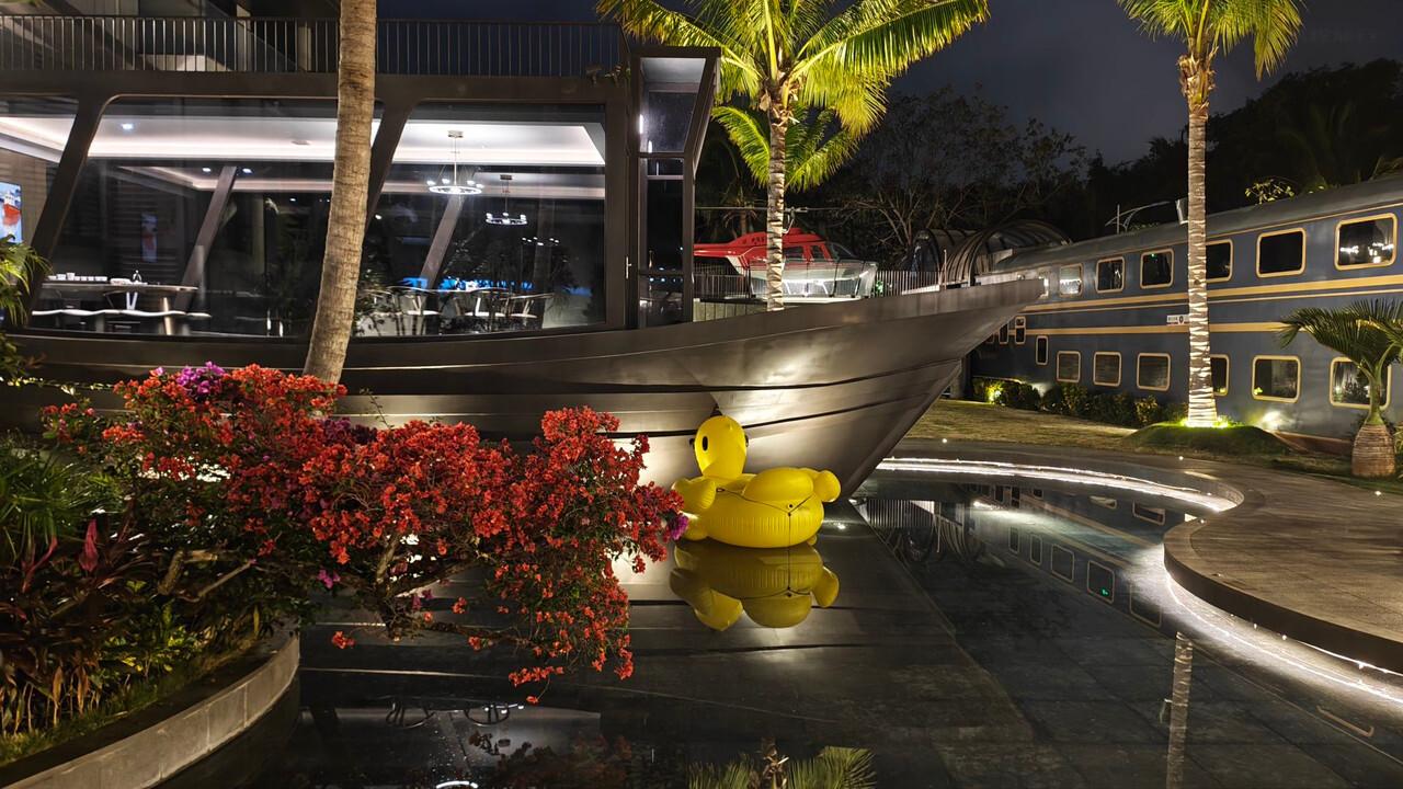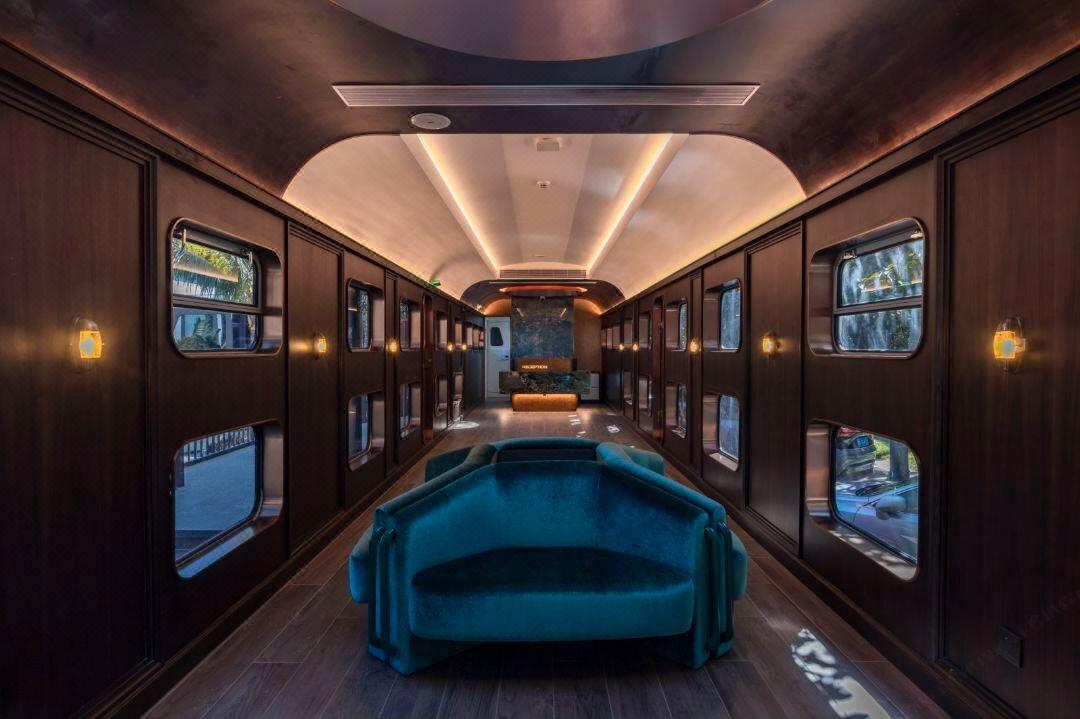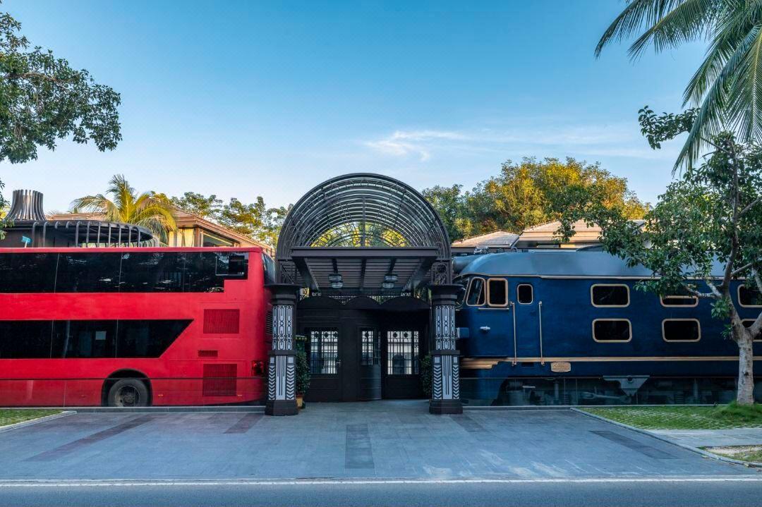 開車來到酒店門口,看到的是一列嶄新的雙層列車停在路邊 ,列車上的標牌寫着鄂爾多斯-三亞,列車,這趟列車既是是酒店的邊界,也是酒店的功能區,酒店的大門就在兩個車廂連接處這個拱門處,門童中還有一個印度小夥。