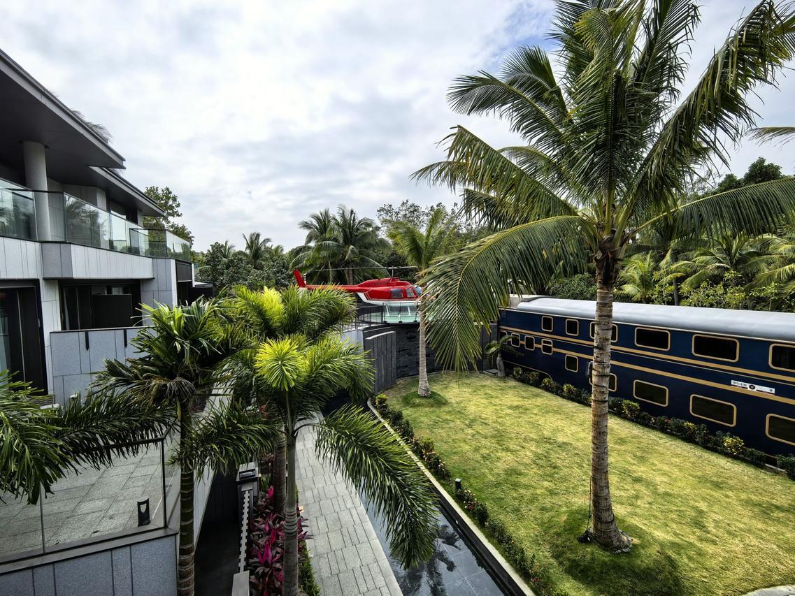 瑞婭酒店有十足的陸海空元素,不僅有火車,還有飛機和帆船。酒店不大的院落裏停着兩架飛機,一架公務機,一架直升機,連門卡鑰匙也很有創意。