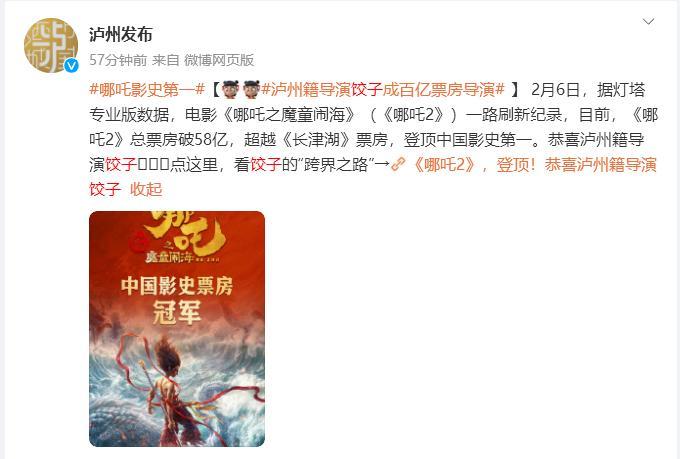 “瀘州發佈”強調導演餃子是瀘州人,並引用餃子採訪:“對瀘州念念不忘。”