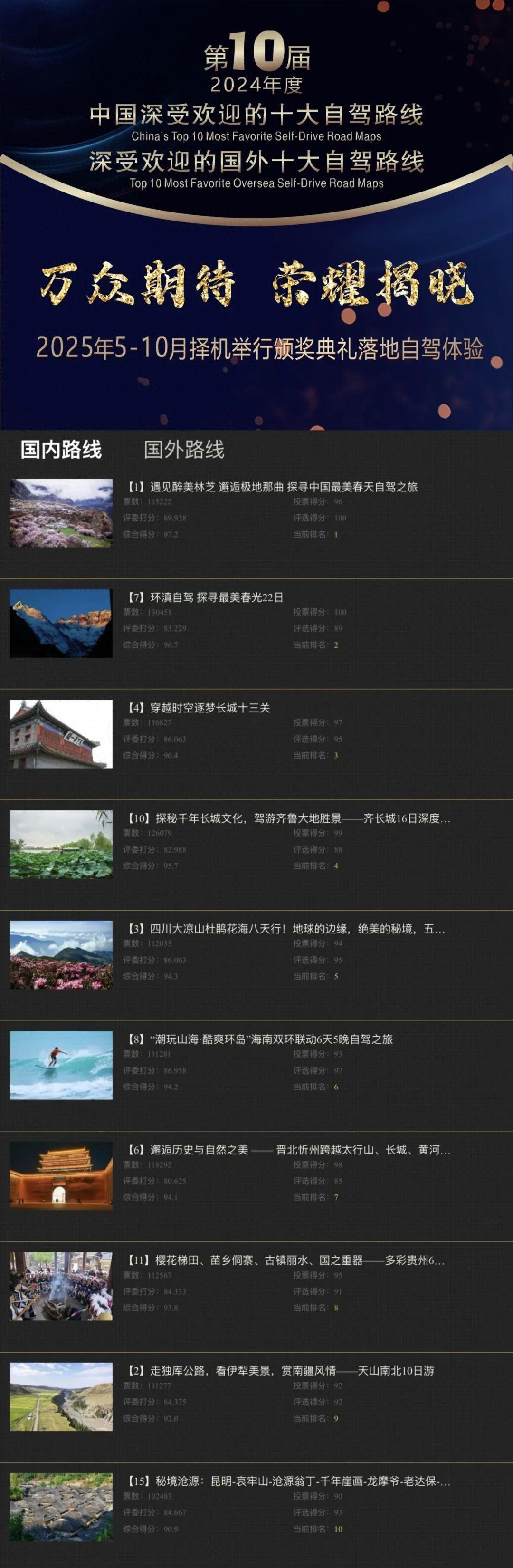 △恭喜第一名、第二名、第三名,獲得第十屆“中國深受歡迎的十大自駕路線”一等獎、二等獎、三等獎;