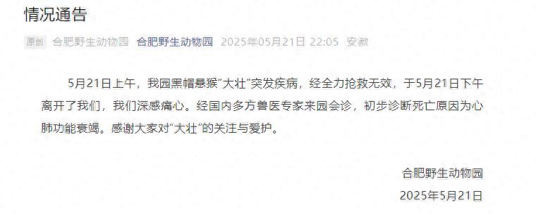 合肥野生動物園5月21日發佈情況通告:5月21日上午,我園黑帽懸猴“大壯”突發疾病,經全力搶救無效,於5月21日下午離開了我們,我們深感痛心。經國內多方獸醫專家來園會診,初步診斷死亡原因爲心肺功能衰竭。感謝大家對“大壯”的關注與愛護。