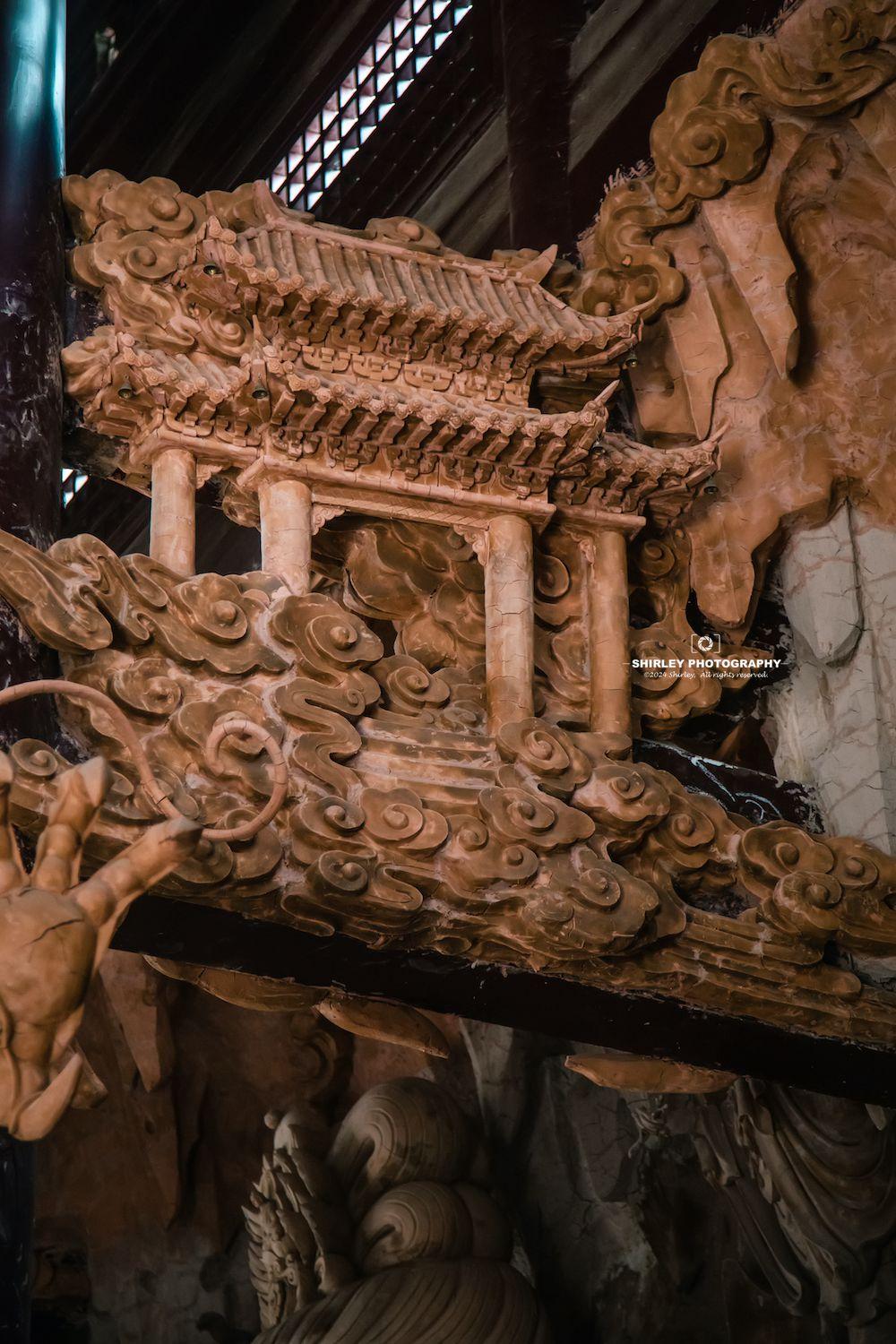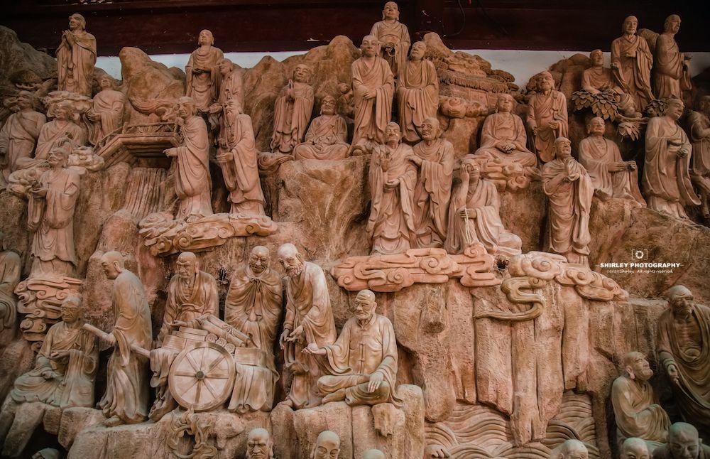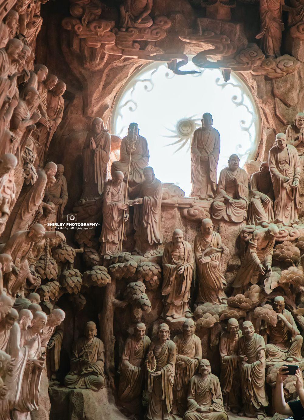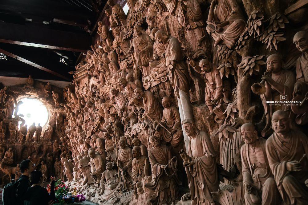 殿內造像看似木雕,實則是採用宜興紫砂泥,由工匠們現場手工雕塑,風格自成一派。五百羅漢形態各異,彷彿從素樸的泥土中被喚醒,衣袂間流轉的線條如行雲流水,眉眼間蘊含的神韻似欲語還休...近距離欣賞,每一尊佛像間微妙的表情區別,細節的呈現都無比生動鮮明。難怪這裏能吸引那麼多攝影與藝術愛好者的關注,“蘇州小西天”名副其實。