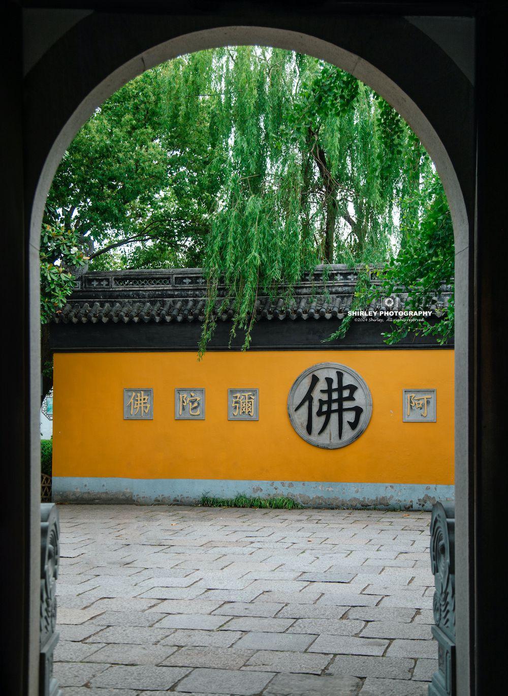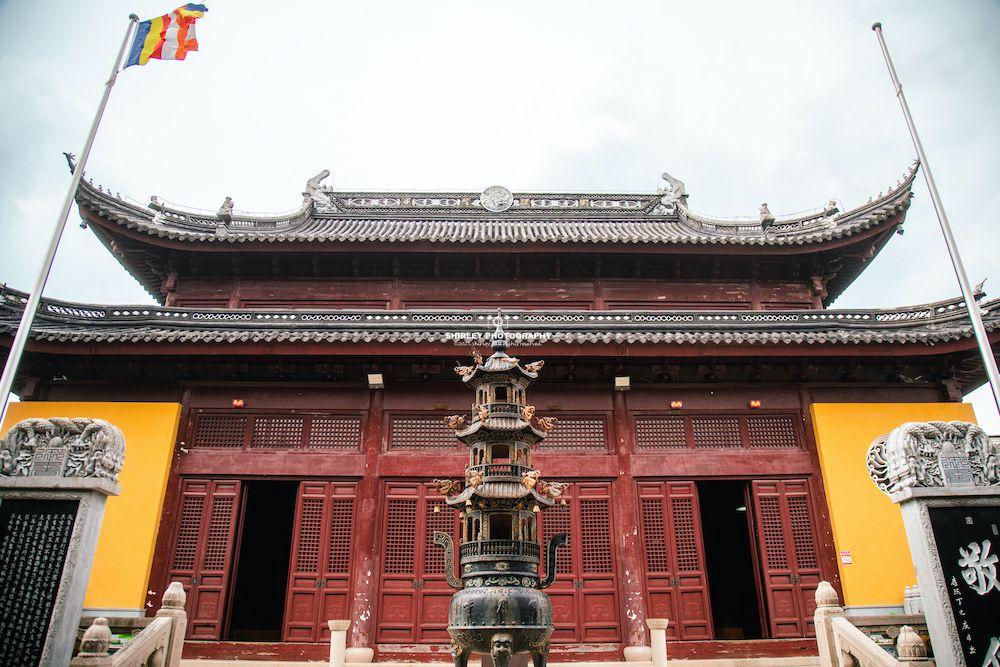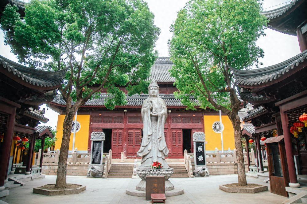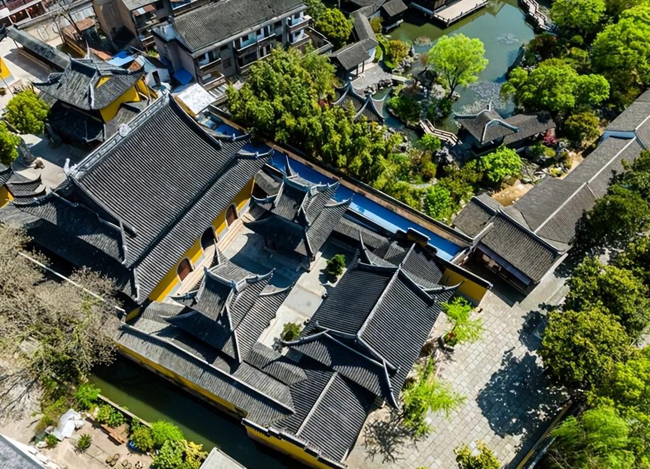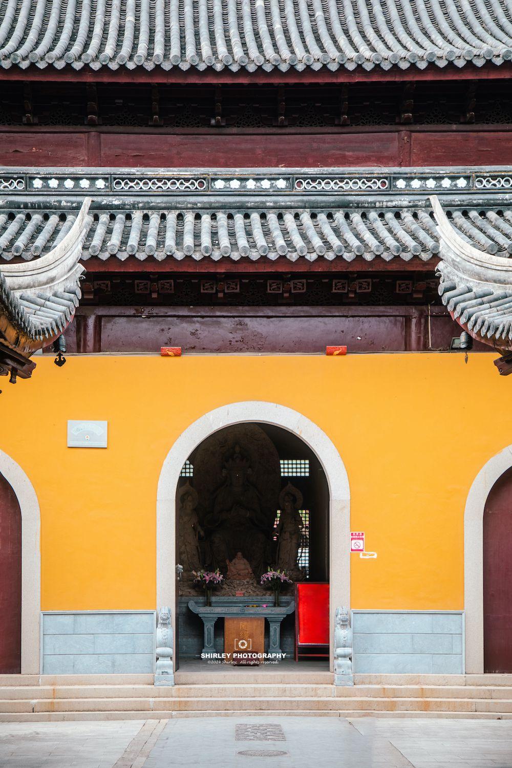 各座殿宇建築均採用江南明清建築風格,並融合佛教規制,重檐歇山頂,戧角上翹,靈動上揚;黃牆灰瓦與古鎮老街相互映襯,別具一番韻味。屋脊飾以精美磚雕,樑柱雕刻細膩紋飾,青磚鋪地與迴廊貫通間,將江南園林的精巧與宗教建築的威儀巧妙融合。
