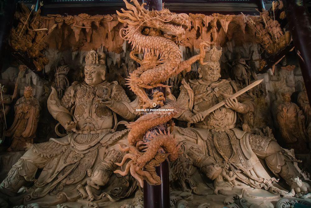 進入山門和天王殿,大肚彌勒一團和氣,端坐正中;四大天王分列兩旁,一個個橫眉豎目,威武猛厲。最近一次翻修已歷時四年多,還沒有完全竣工,天王殿裏還搭着腳手架,造像也都是素色,不知後面是否會施以彩繪。但是四大天王以及周邊的雕塑已然難掩奪目光彩,木雕盤龍、天宮樓閣皆栩栩如生,幾百年後應不遜色于山西那些古寺。