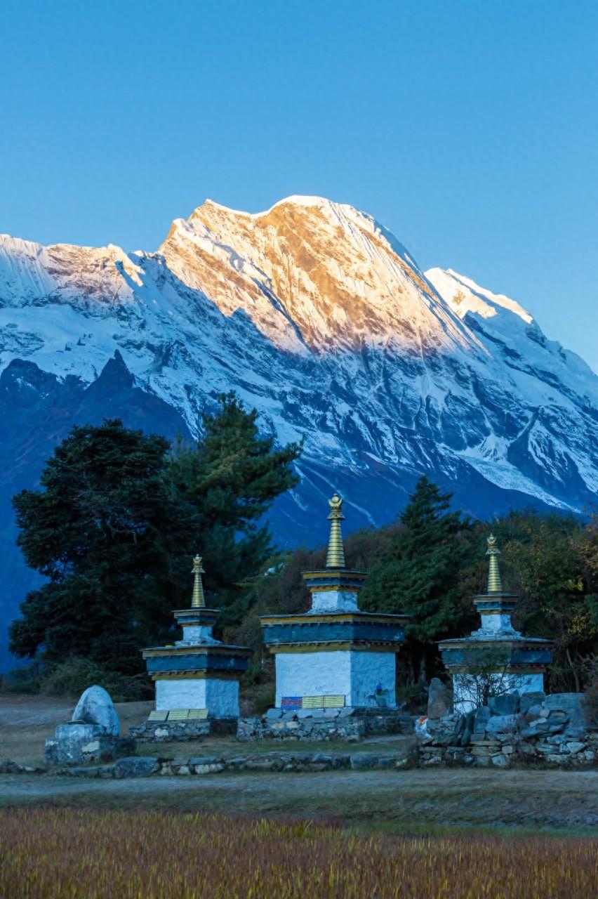 只見一幢幢藍頂白牆的藏居,錯落有致地分佈在草甸上,牛羊閒庭散步,希夏邦瑪峯就在村落前方遙遙獨立,只覺仙靈悠然.....