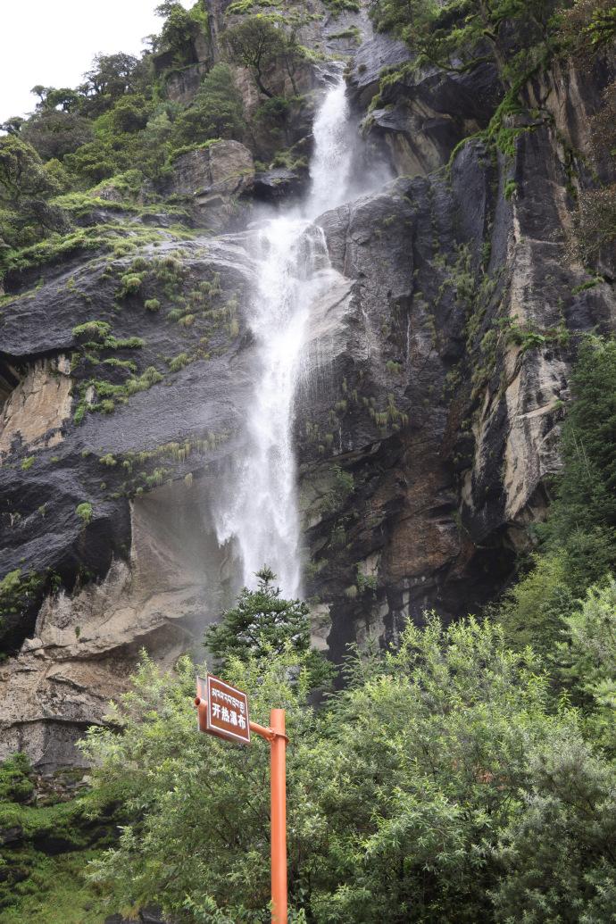 瀑布高約300米,從陡峭山崖的“V”字形埡口噴湧而下,水流如白色哈達垂掛山間,周圍被原始森林、雪山環繞,頗爲壯觀。