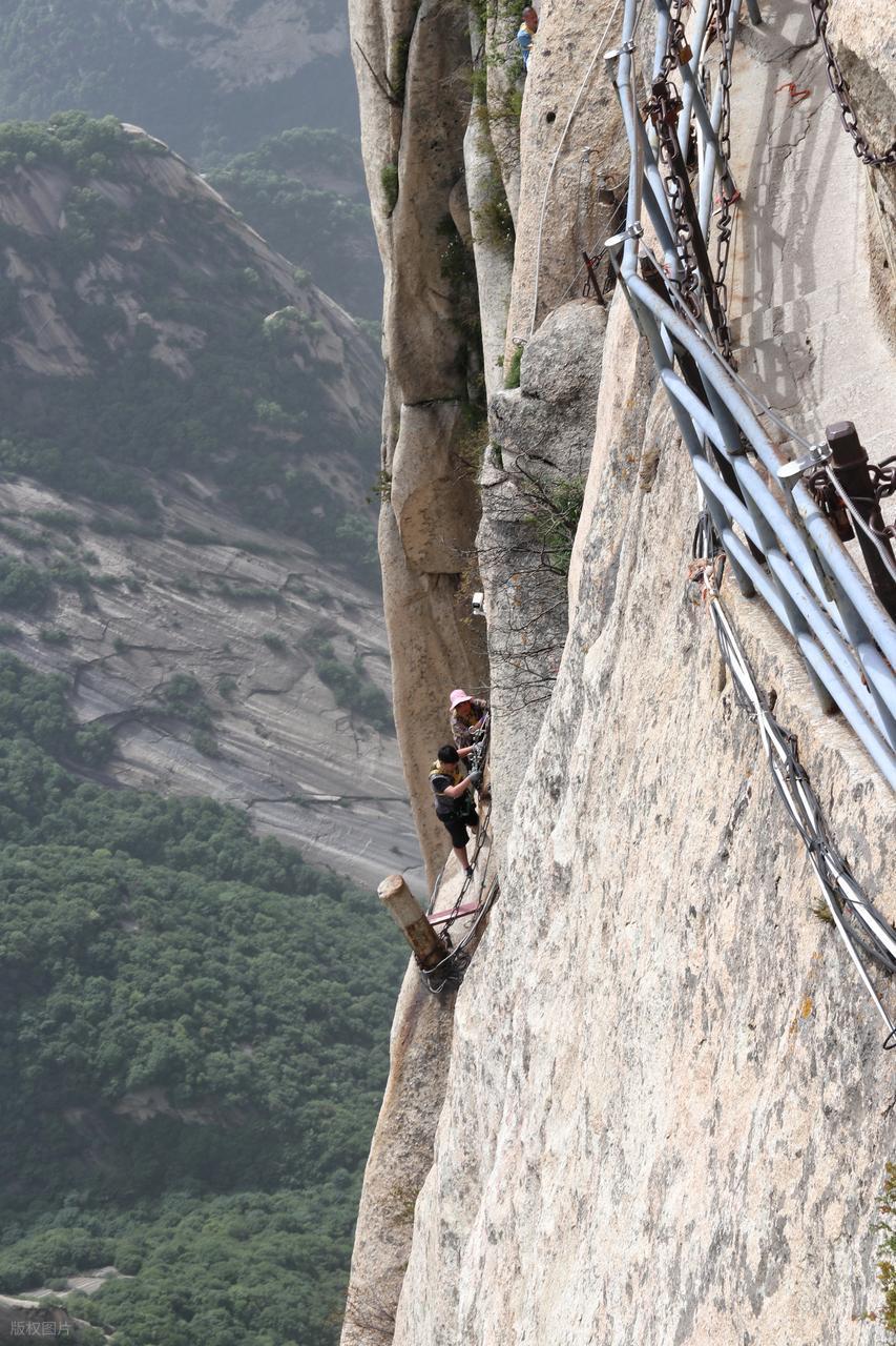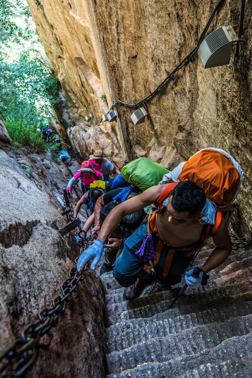 華山和黃山比起來就更爲險峻,“自古華山一條路”已經是天下共識,千尺幢、百尺峽、老君犁溝等地段有近乎垂直的懸崖絕壁,全程都需拉鐵鏈,過長空棧道和鷂子翻身還需要系安全帶,手腳並用來攀爬,北峯到東南西諸峯有一些路段多懸崖而且無護欄,恐高者還要慎行,爬華山不僅對體力,對心理也是一個極大的挑戰。