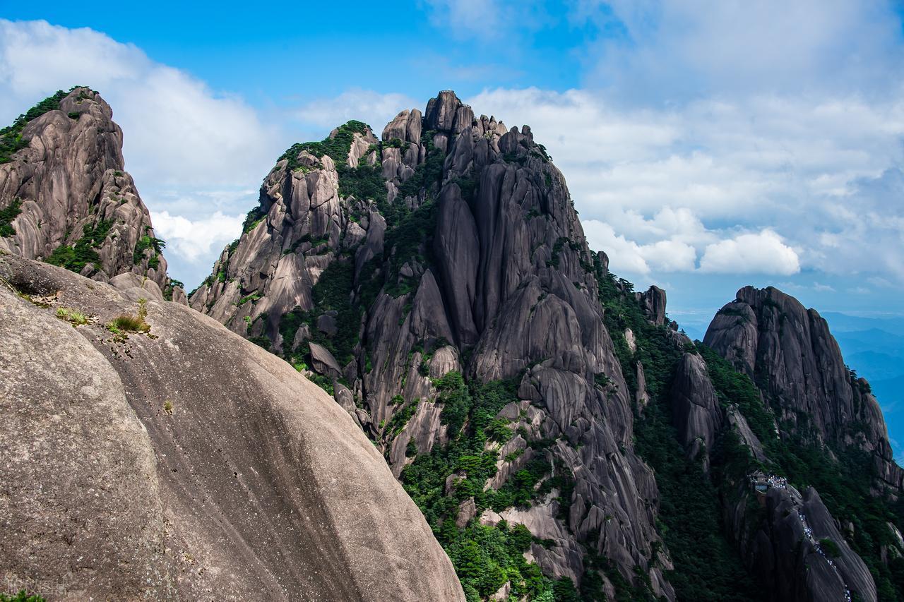 黃山臺階多而且比較較寬,部分路段較平緩,像西海大峽谷環線等路段,但黃山的路上上下下的也比較恐怖,比較險峻的地方爲天都峯,坡度近80°,爬起來要手腳並用,蓮花峯從山腳到山頂爬升超過1500米,還有山脊狹窄的鯽魚背也比較難爬,黃山的天都峯和蓮花峯常年輪休,今年又輪到天都峯開放,蓮花峯輪休,其他路段相對安全,適合普通的遊客。