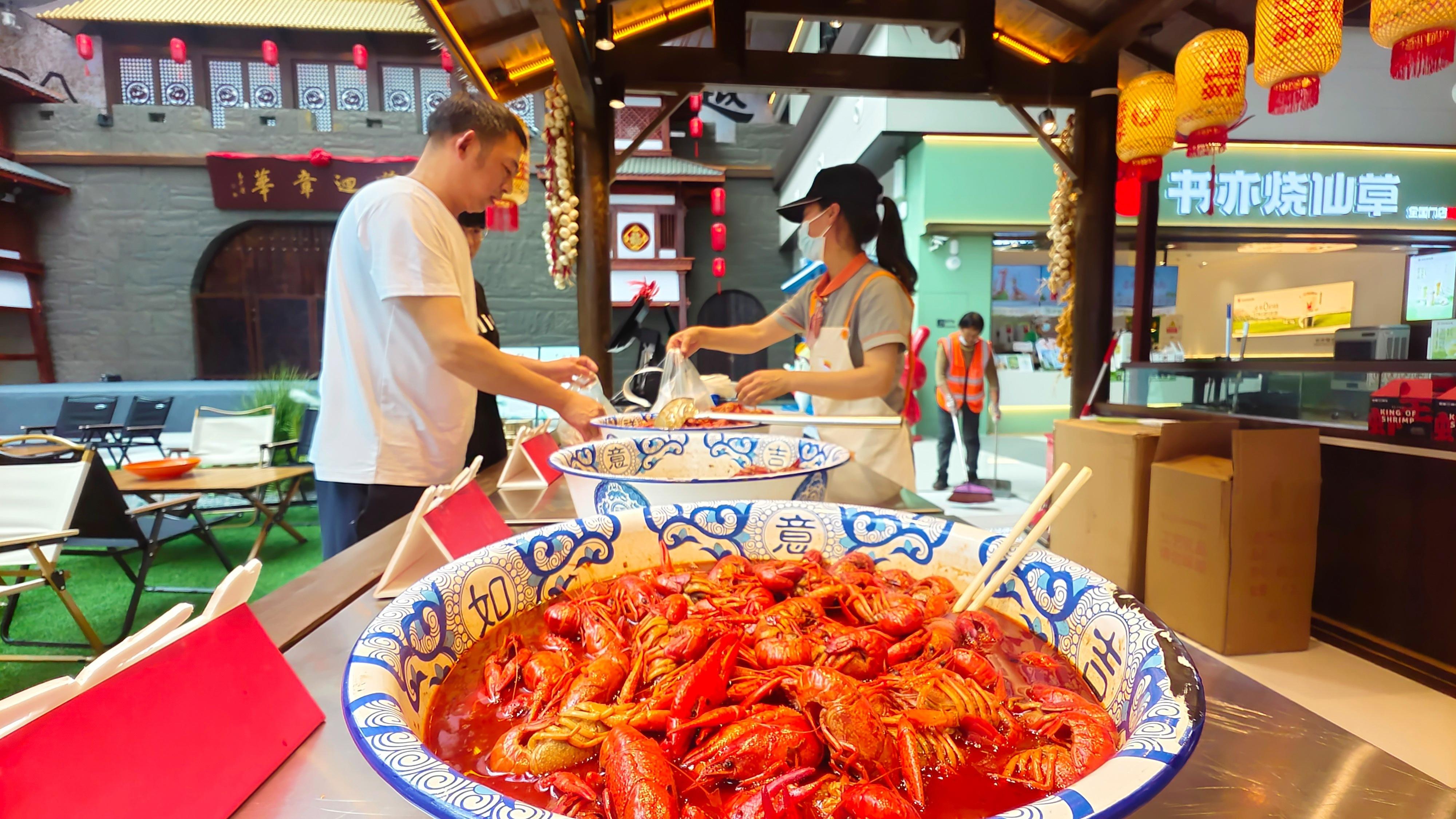 中午時分,小龍蝦美食專區飄來了陣陣帶着辣味的鮮香,一盆紅彤彤、冒着熱氣的麻辣小龍蝦被端上了桌。在武漢工作的周雯和閨蜜邊喫邊看節目。“小龍蝦鮮嫩多汁,麻辣中帶着回甘,就爲這一口,以後還要再來打卡。”周雯說。