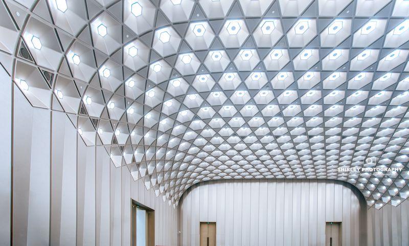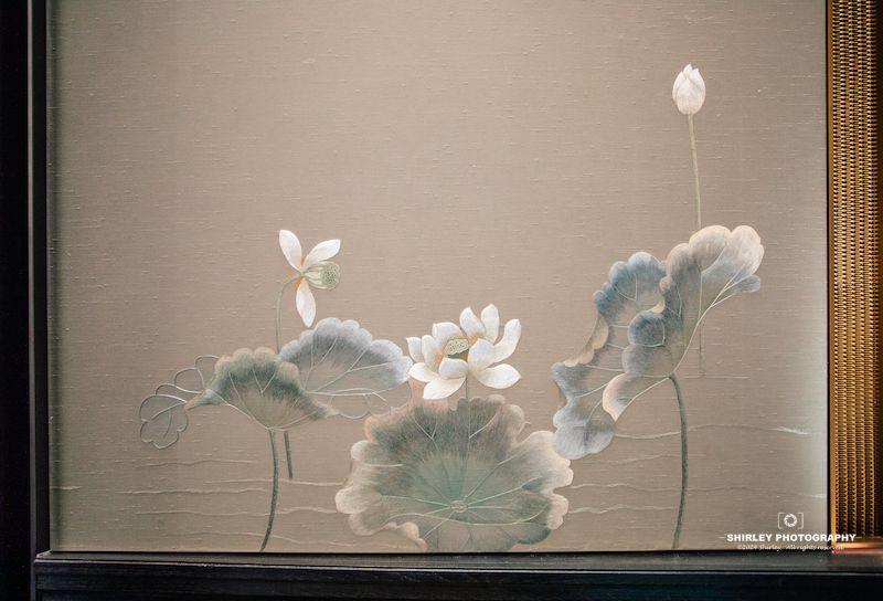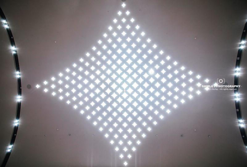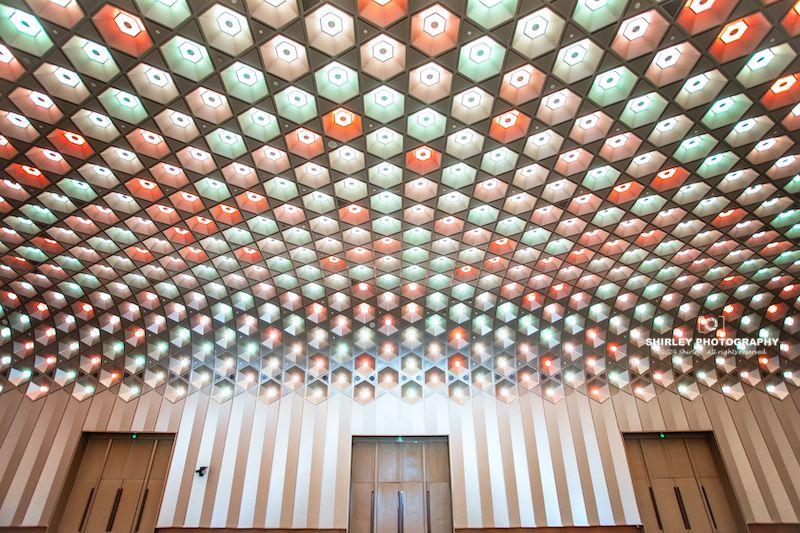 頂燈是盛開的花卉圖案,八邊形的天花板外是四邊形框架,寓意喜迎八方客,誠待四海賓。