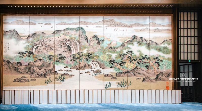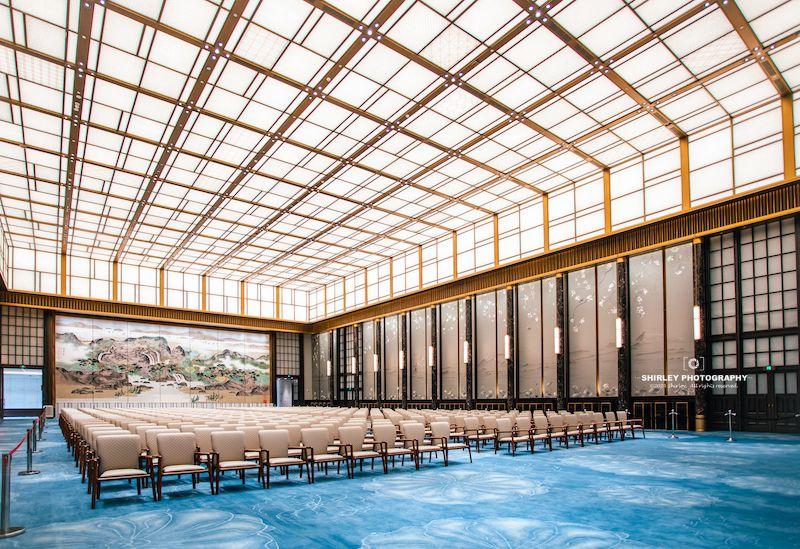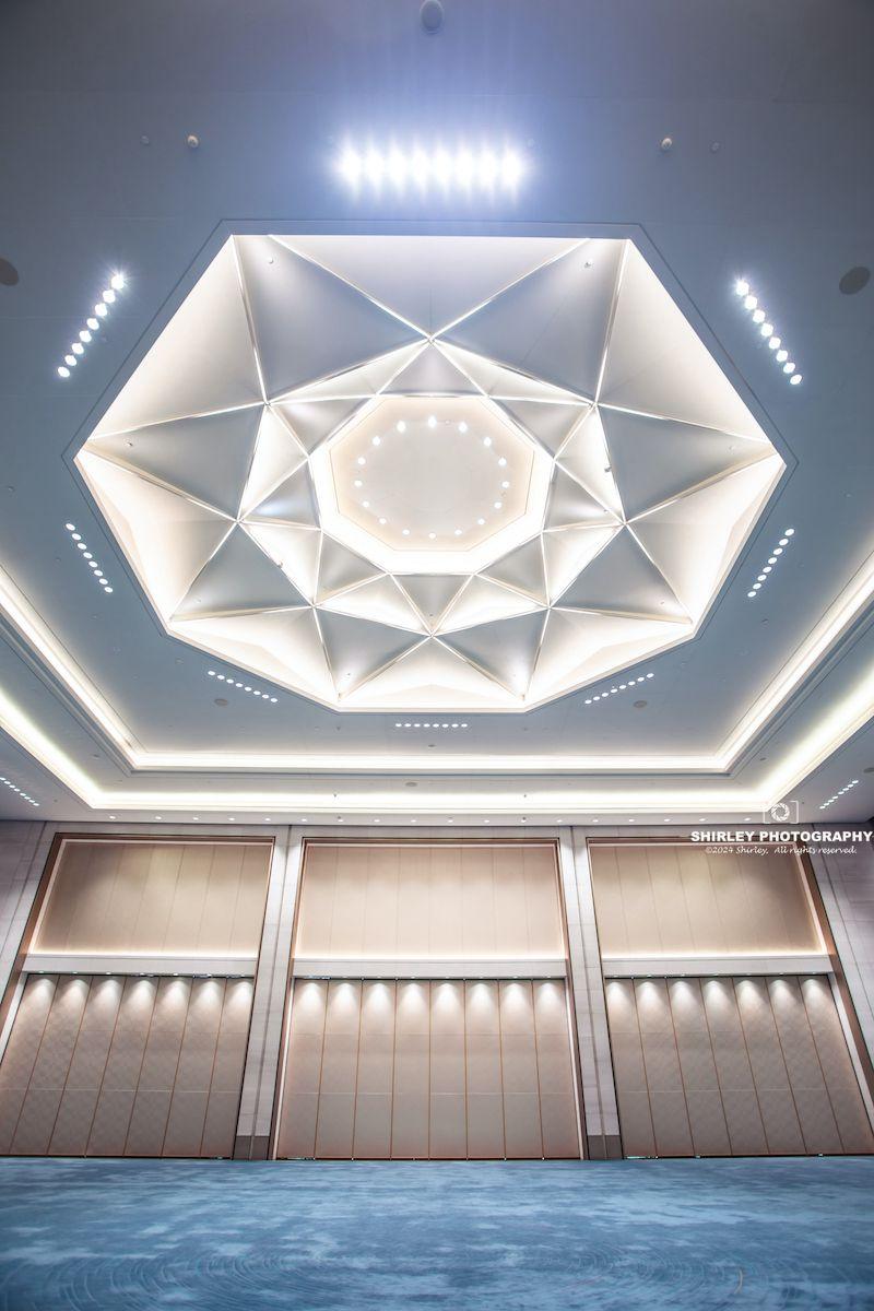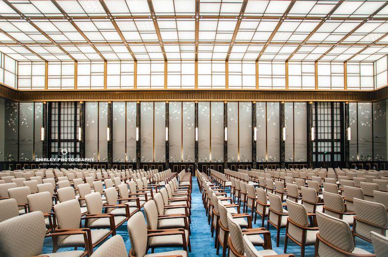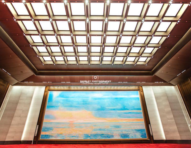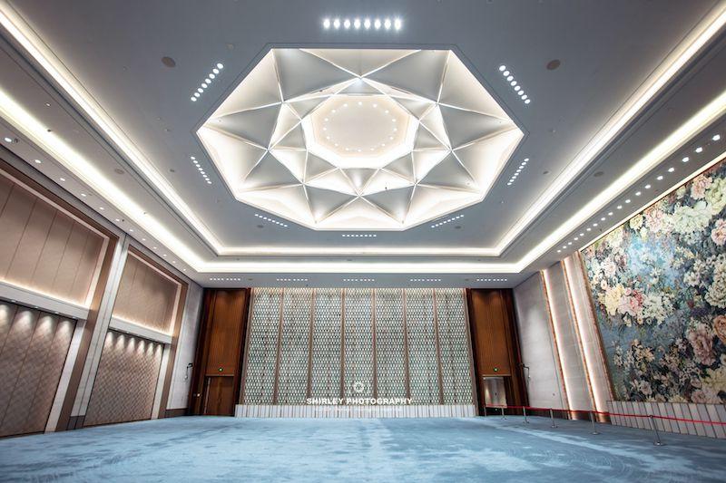 十分海派的artdeco設計風格,22根希臘進口的黑金花大理石柱、由286位蘇州當地繡娘用時3個月才完成的巨幅蘇繡牆面組成中西融合的大型會議廳,適用於舉辦中等規模的高規格活動。恰好我們參觀的時候內部擺放着座椅,人民大會堂的感覺立刻到位了!