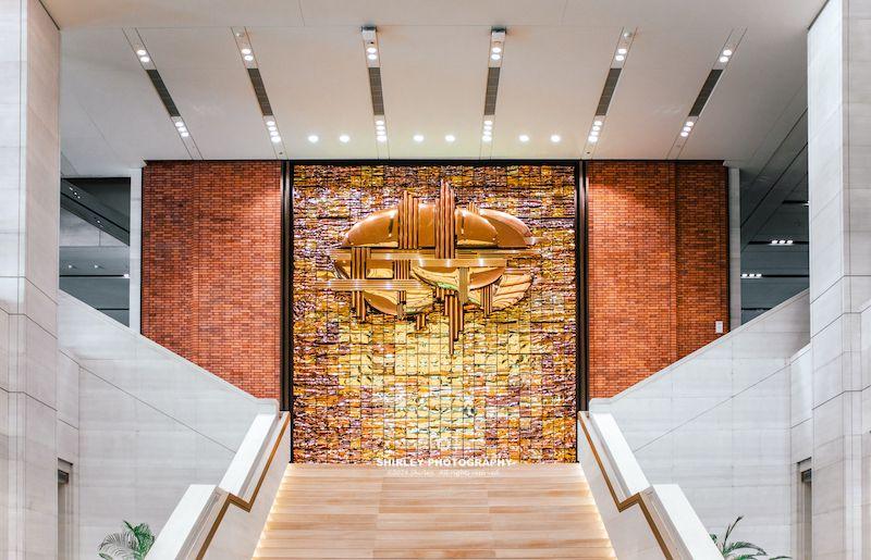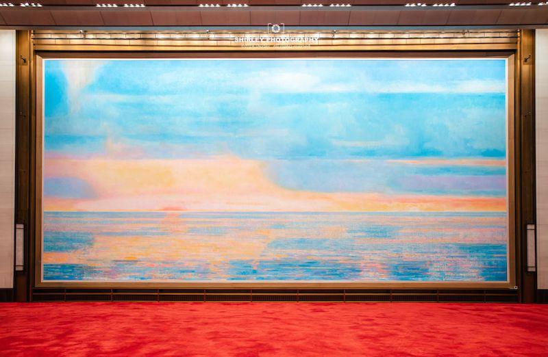 這裏是大會見廳的前廳,連接觀景平臺和大會見廳,是世界會客廳迎送嘉賓的最佳場地選擇之一。背景是國內最大的琉璃多媒體藝術裝置牆《江南印象·綠水青山》,取材於北宋王希孟的《千里江山圖》,由2828塊手工琉璃,與鑲嵌在後面的LED顯示屏的動態山水共同構成。