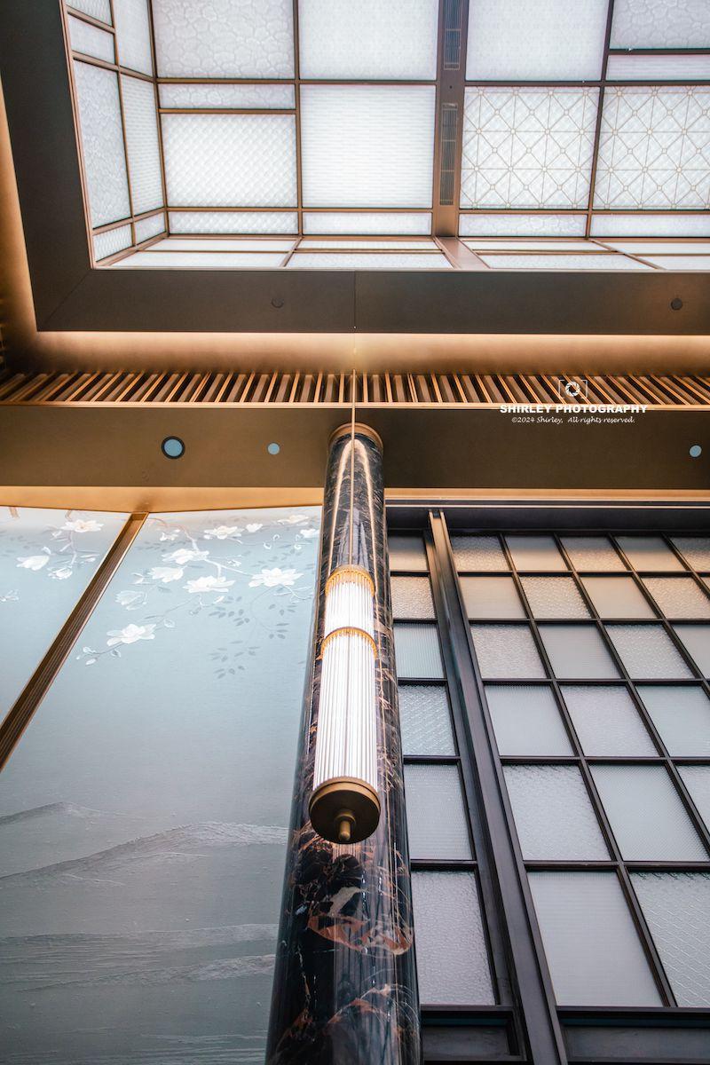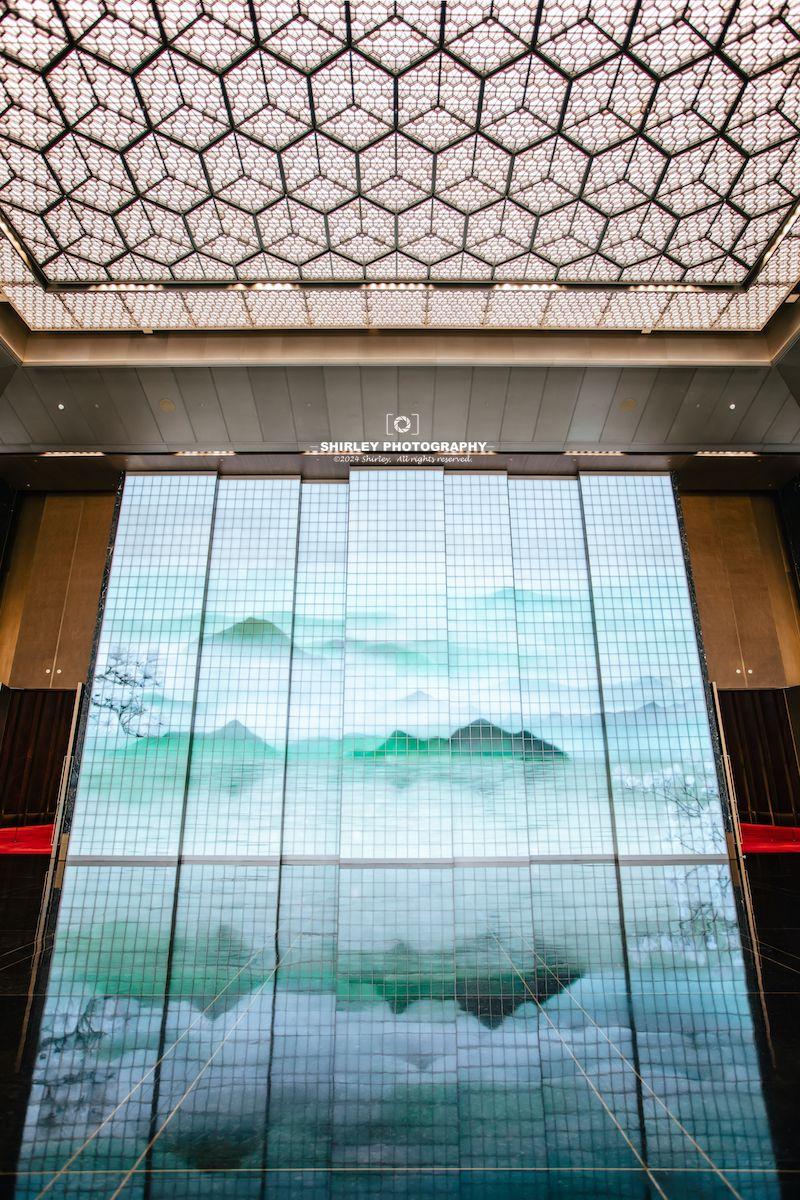 顯示屏上的動態山水與琉璃疊加,玉蘭花映襯下的江南山水畫面應四時而變,展現出一派富有生機的江南圖景;配上大理石地面的倒影,可謂虛實結合,極具氛圍美感。現在是夏天,因此顯示屏上的主體色調爲深淺不一的青綠色,據說到了秋冬會變爲金色黃色這樣的暖色調。