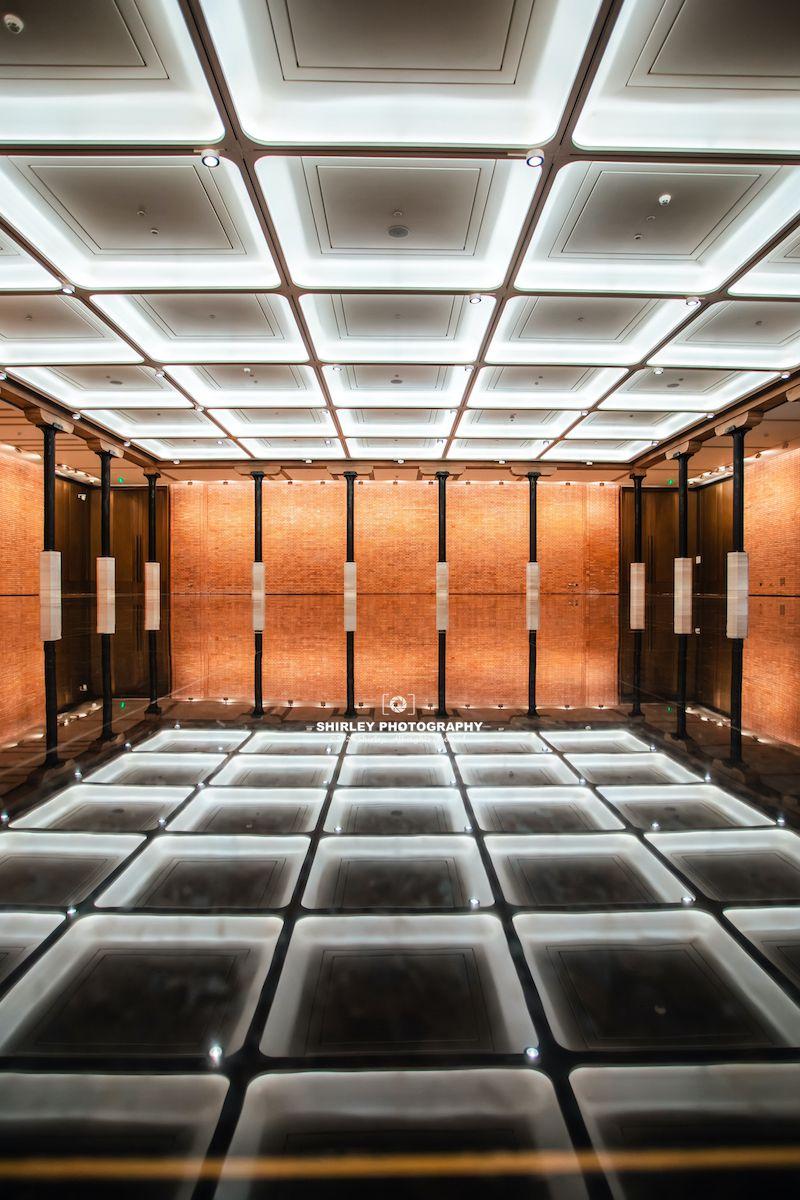 氣派開闊的中庭,是世界會客廳給遊客的第一印象,直線形的樓梯連接起G層和1層的迴廊。這個區域可作爲迎送嘉賓的矚目場所,也可以舉辦開放式酒會、招待會等活動。背景是藝術家曾成鋼的浮雕《海上明月共潮生》,明明是靜態,卻彷彿流淌着黃浦江的江潮浩瀚。