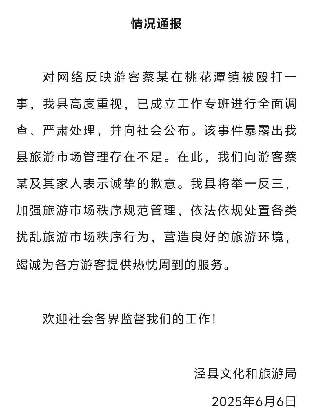 6月8日,安徽涇縣聯合調查組對遊客蔡某被毆打一事發布情況通報。