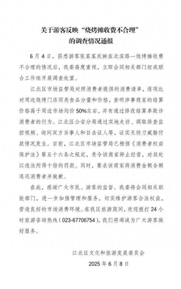 新華社重慶6月8日電(記者李曉婷)重慶市江北區文化和旅遊發展委員會8日就“遊客反映燒烤攤收費不合理”一事發布調查情況通報稱,商家結算價格高於周邊市場均價50%,並存在欺詐消費者的行爲。