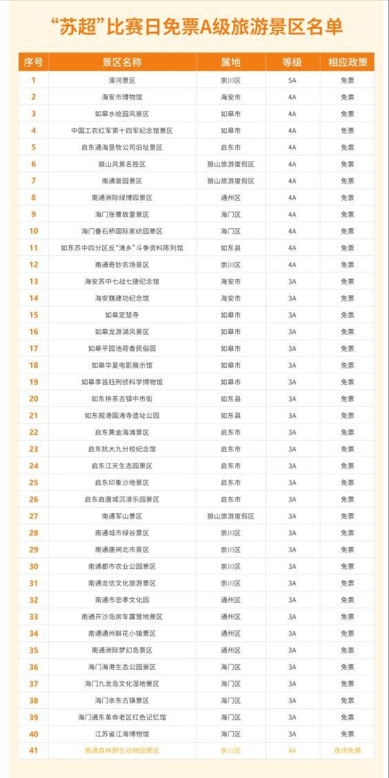 持有“蘇超”任一比賽場次票根的觀衆,可至參與相關活動的商家及第四屆南通啤酒嘉年華活動現場享受專屬優惠,並在票面比賽場次當日及前後各兩天(共5天),享受南通40家A級旅遊景區免費1次入園優惠。