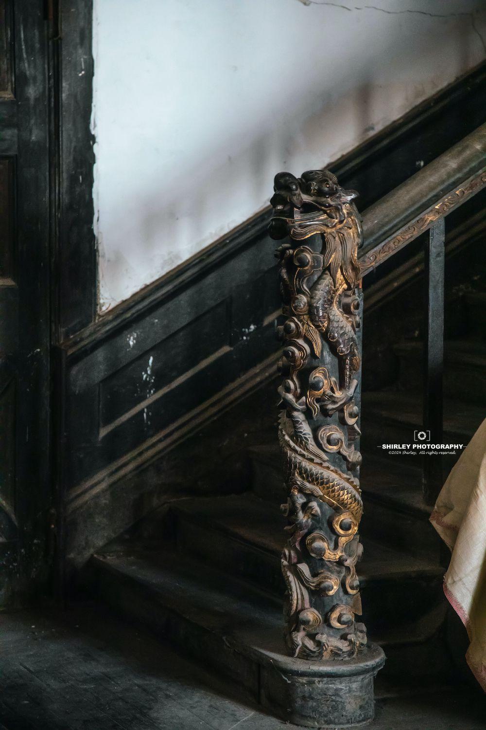 公共空間裏最令人矚目的便是樓梯轉角處的雕花立柱,我拍過很多修繕過、或者原生態的上海老建築,這種形制的樓梯立柱第一次看見。立柱頂部雕刻爲獅頭,因爲建屋年代還處於晚清時期,李鴻章又在朝廷身居高職,不雕龍頭而雕獅頭也正是因爲主人不敢僭越逾矩。栩栩如生的獅頭口中含有一珠,跨越三個世紀整根柱子金漆尚存,在昏暗的室內依舊難掩光彩,霸氣凌人。